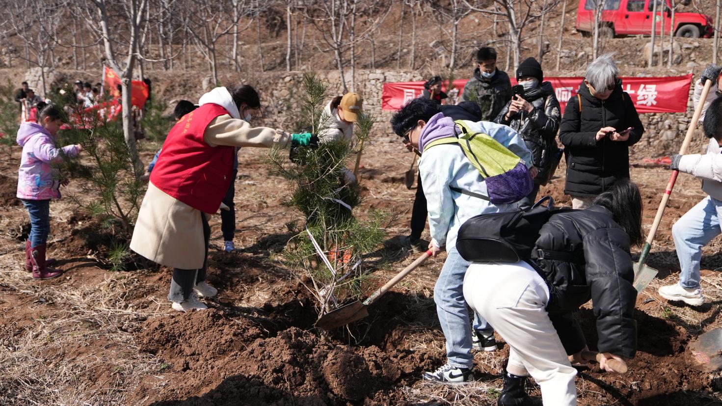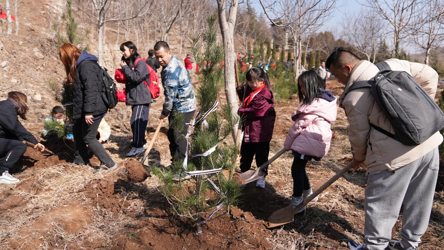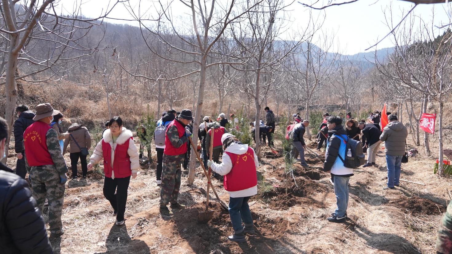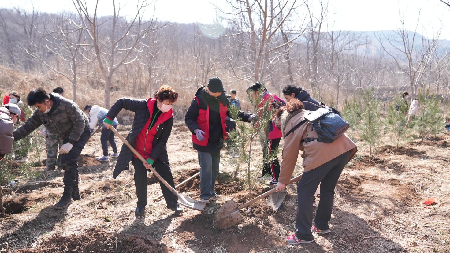 植树现场,大家拿着锄头、铁锹、水桶等工具,或两人一组,或三五成群,挥锄铲土、分苗定植、扶苗填坑、提水浇灌,经过1个多小时的奋战,小树苗迎风而立、错落有致,在春日的映照下展现出勃勃生机。大家在自己种植的小树上挂牌标号,认领守护责任,享受着劳动的快乐,一排排新栽植的树苗昂然挺立,为原山增添一抹新绿的同时也孕育着无限希望。