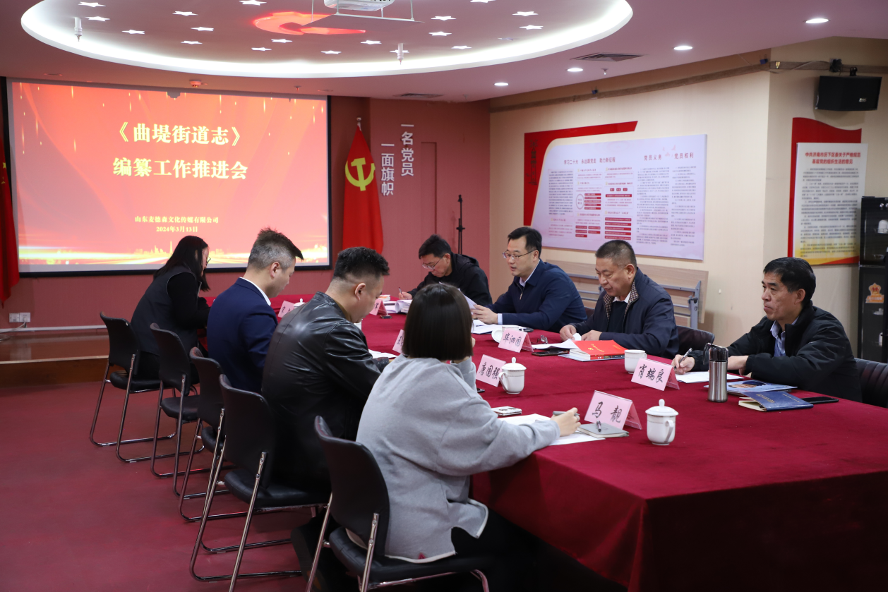 3月13日,由飞极速在线旗下山东麦德森文化传媒有限公司承办服务的中国名镇志文化工程济阳《曲堤街道志》编纂工作推进会在集团总部党群活动室召开。