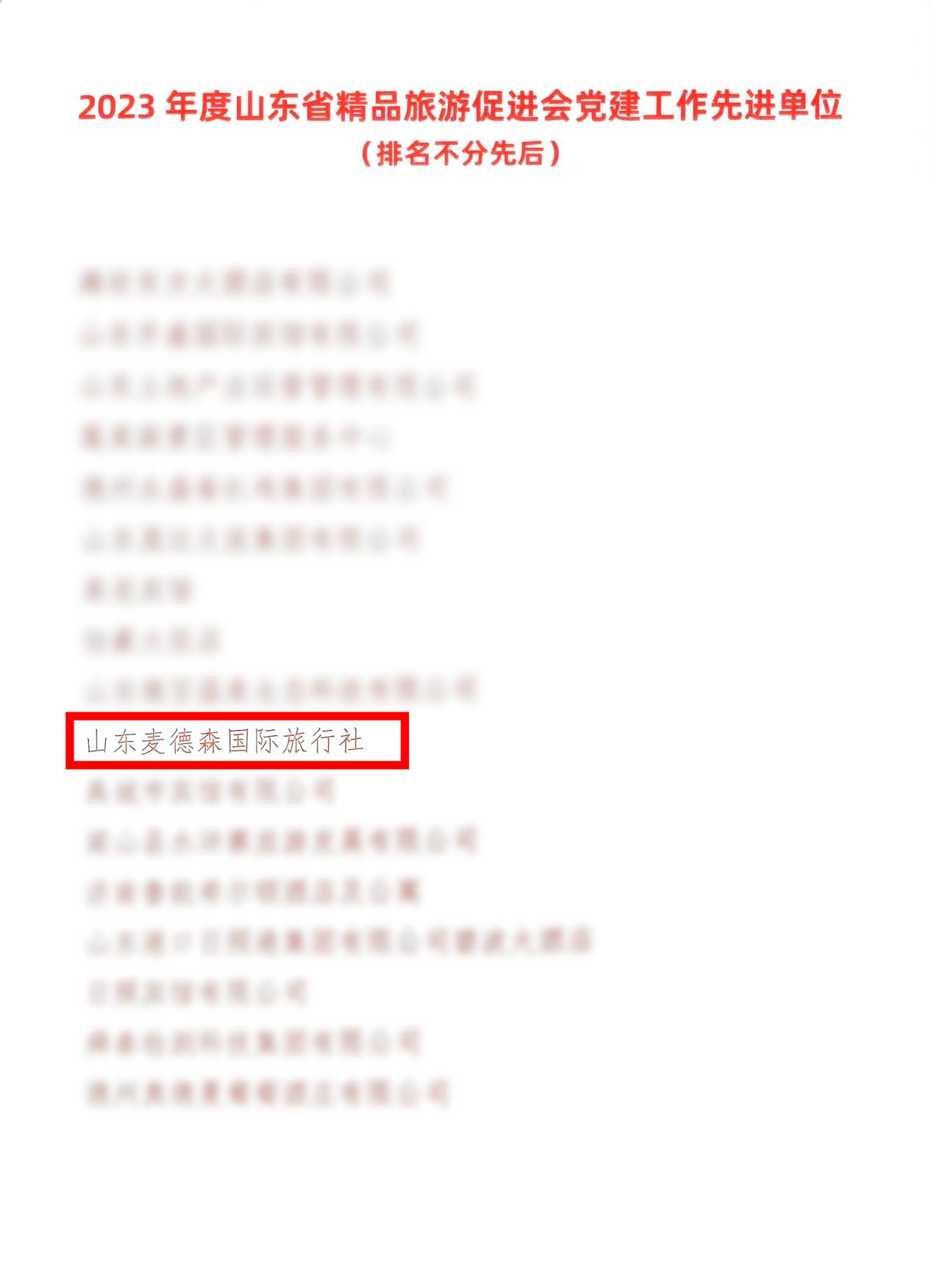 山东麦德森国际旅行社有限公司获颁2023年度山东省精品旅游促进会党建工作先进单位