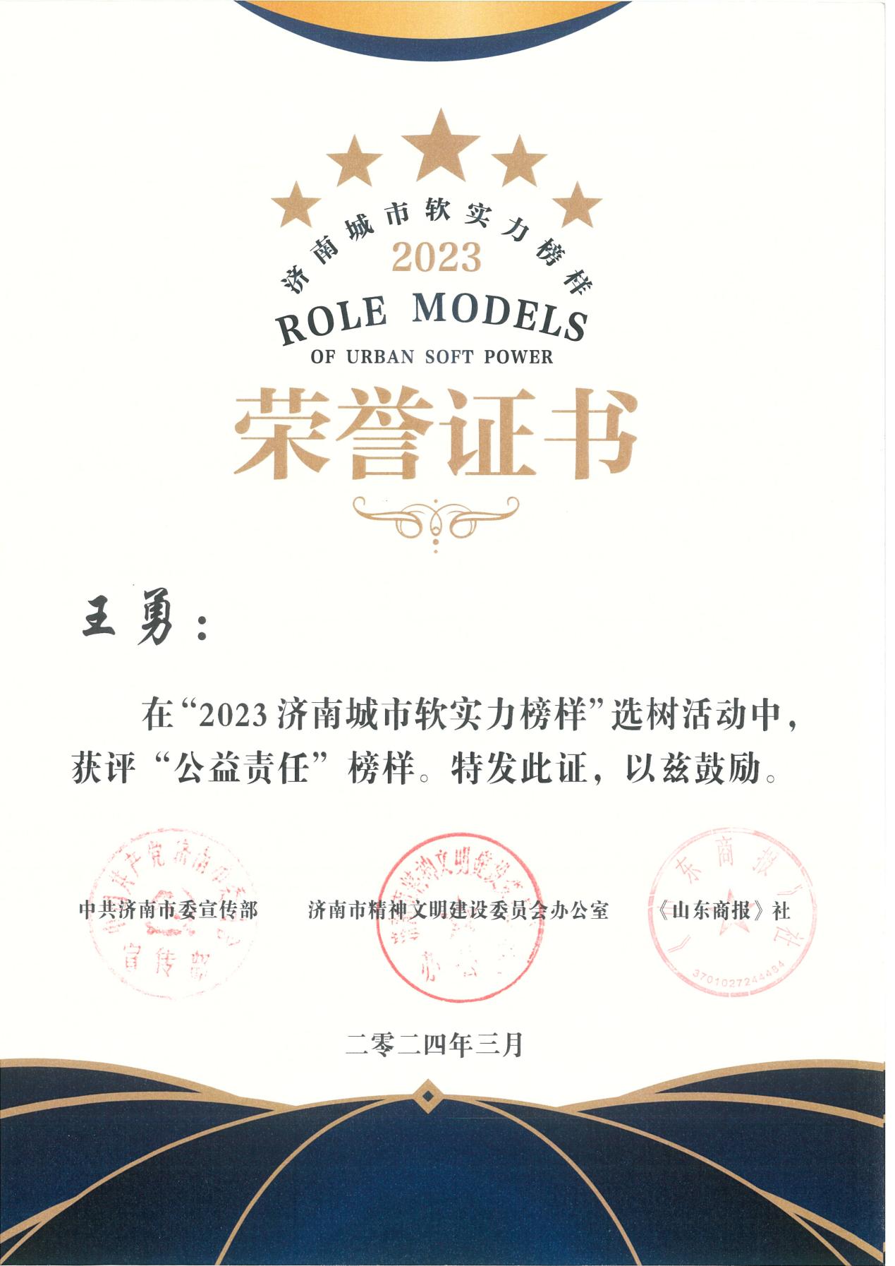 集团党支部书记、董事长王勇出席盛典,并获颁“2023济南城市软实力-公益责任榜样”。
