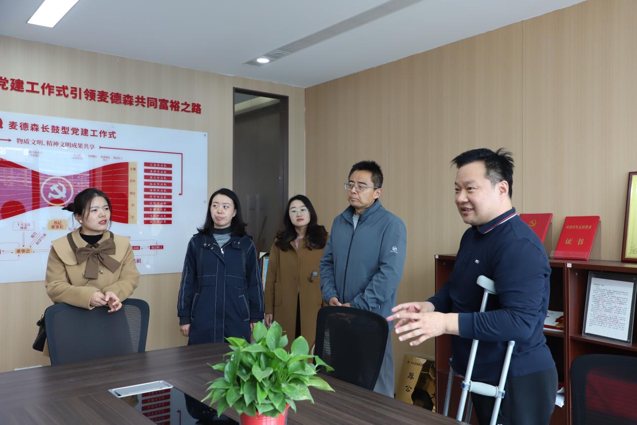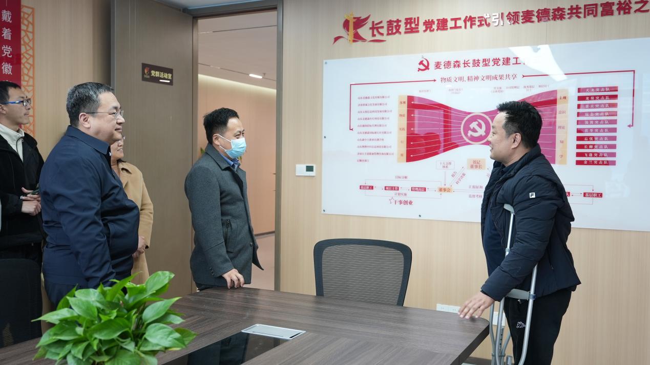 调研伊始,山东中医药大学马克思主义学院、中医文献与文化研究院,济南幼儿师范高等专科学校学前教育学院相关领导参观了麦德森党群活动室,详细了解了集团以“长鼓型”党建工作式引领麦德森共同富裕之路。