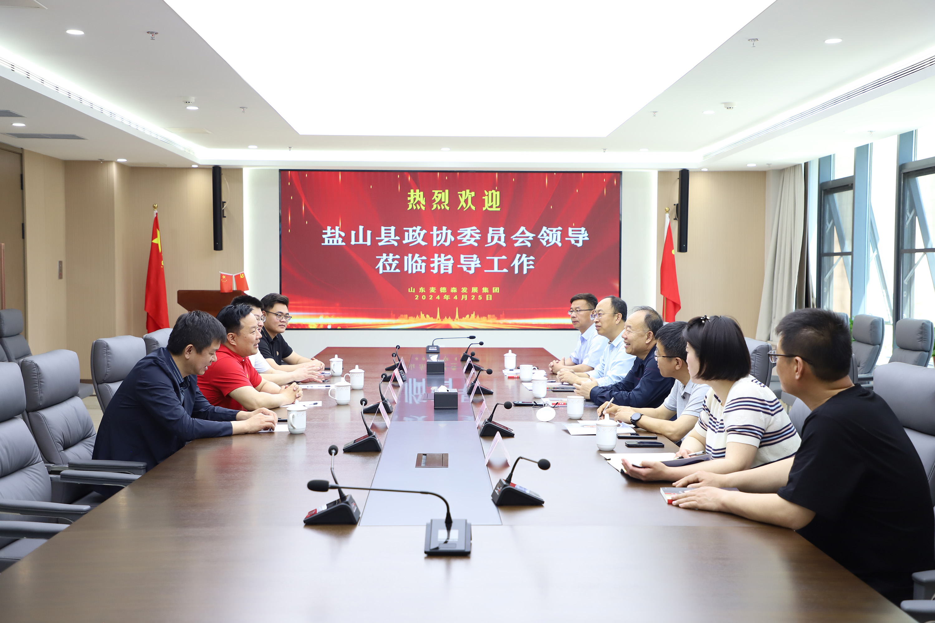 4月25日,盐山县政协一行在党组书记、主席付志敏的带领下莅临山东麦德森发展集团,就集团党建及各产业项目建设发展情况等开展调研。
