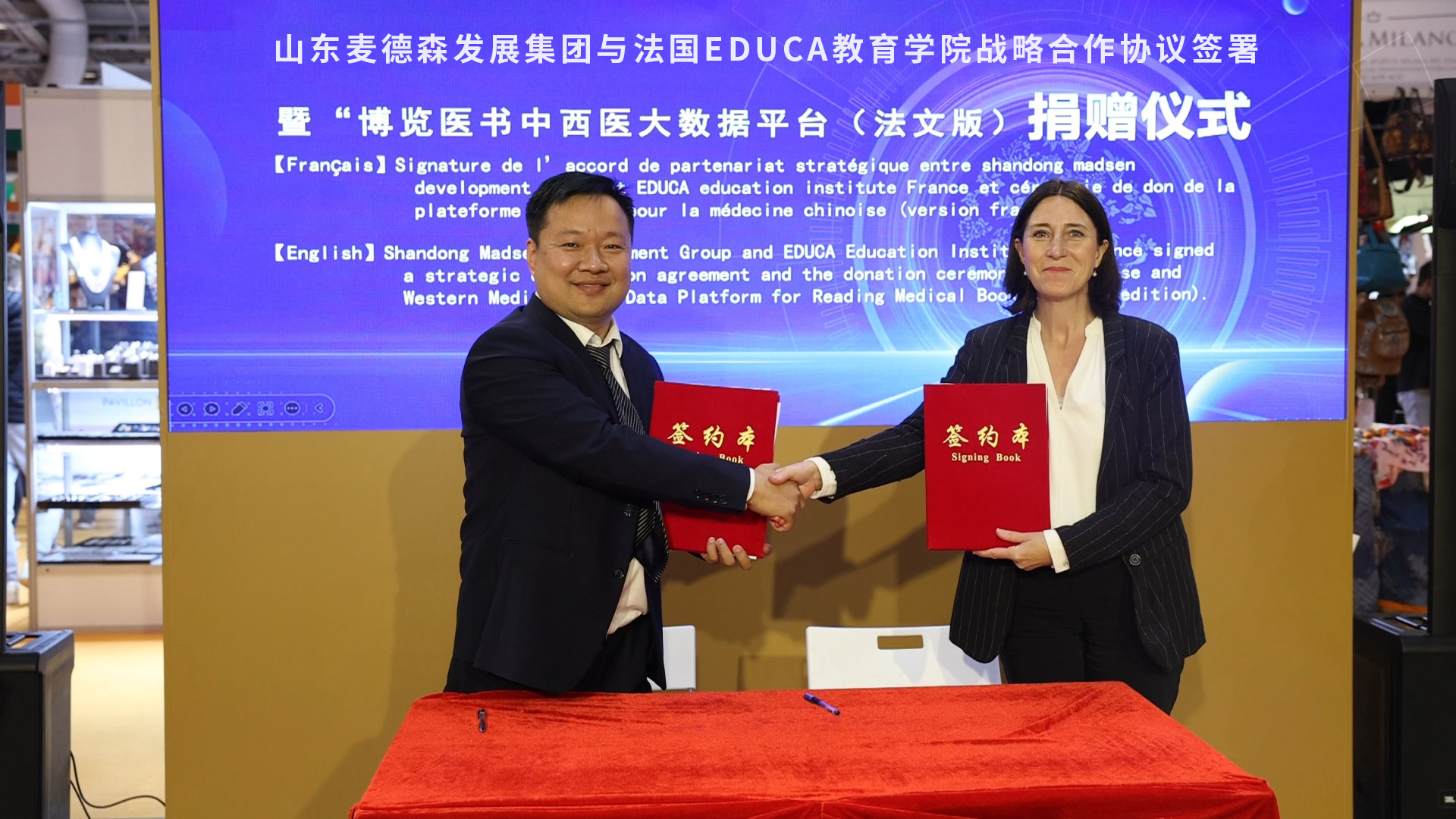 其中,山东麦德森发展集团与法国EDUCA教育学院就“中医药临床技术推广及基础研究”等内容签署《战略合作协议》,并向法国EDUCA教育学院捐赠“博览医书”中西医百科数据平台使用权限。