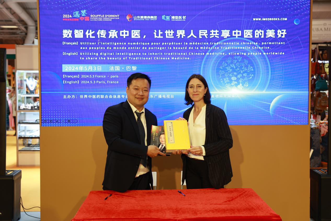 展会期间,5月3日,由世界中医药学会联合会信息专业委员会、山东广播电视台主办,山东麦德森发展集团有限公司承办的以“数智化传承中医,让世界人民共享中医的美好”为主题的中医药日系列活动在法国巴黎凡尔赛门展览馆举行。