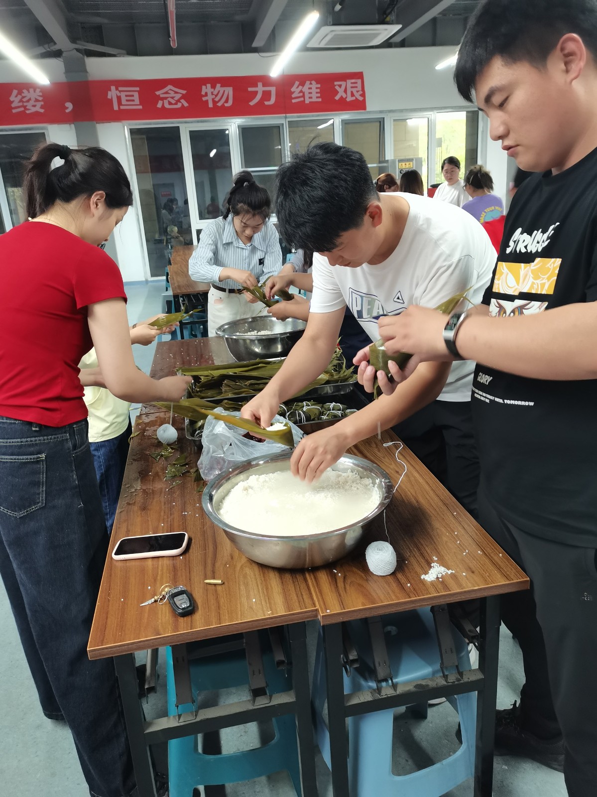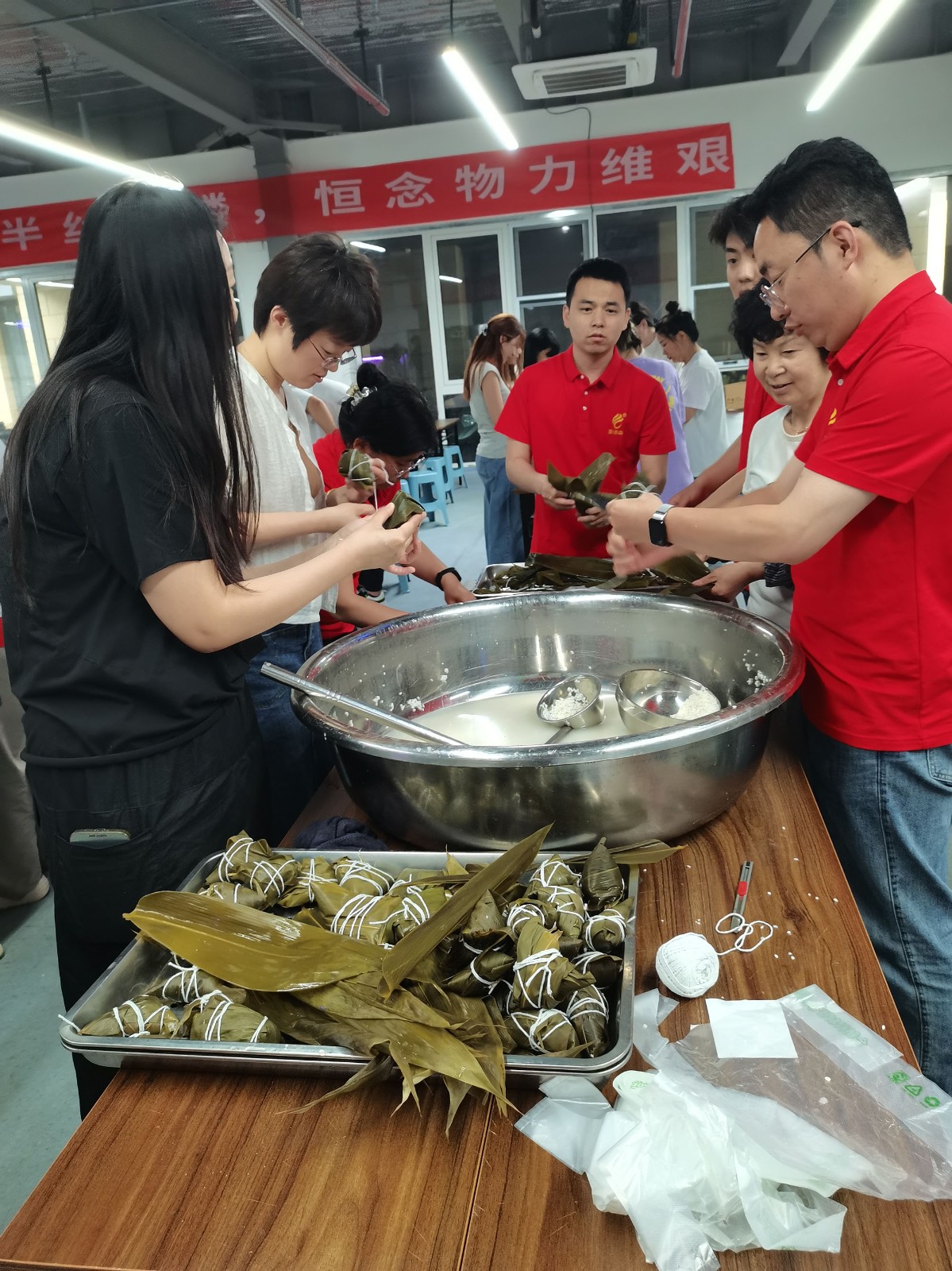 在集团餐厅工作人员悉心指导下,职工们纷纷参与到包粽DIY实践中,活动现场欢声笑语,其乐融融。