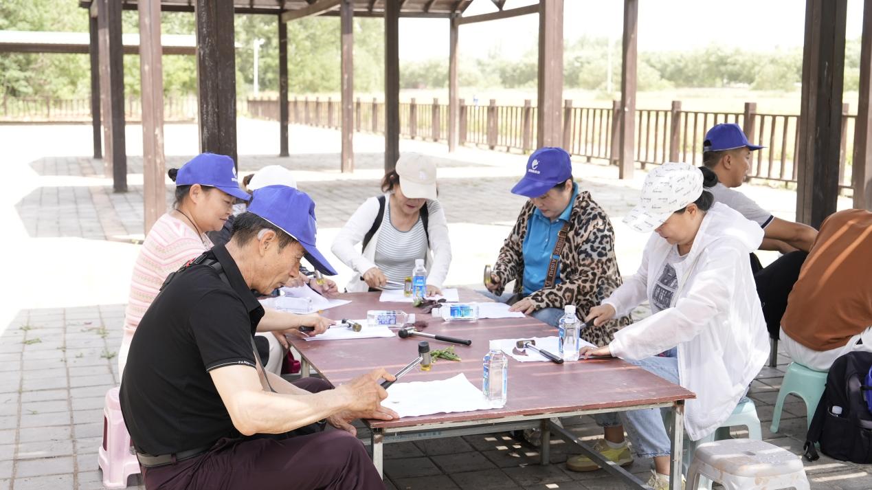 在手工扎染环节,大家以小组为单位,在讲解员的指导下利用自然中植物的花、草、茎叶等进行的植物扎染,将漂亮的树叶和花朵夹在一层白色棉布之间,用小锤敲打,植物的纹理和汁液印在白布上形成美丽的图案。