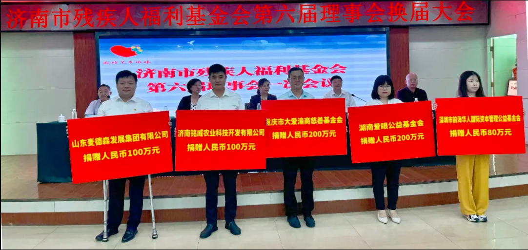 会上,山东麦德森发展集团党委书记、董事长王勇当选为济南市残疾人福利基金会第六届理事会副理事长,并代表集团向济南市残疾人福利基金会捐赠100万元公益基金。