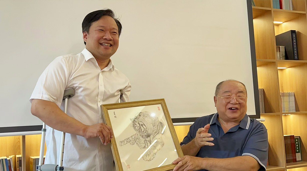 中国肢残人协会副主席汪凯燕(右一)向王勇(左一)捐赠画作《虎妆》