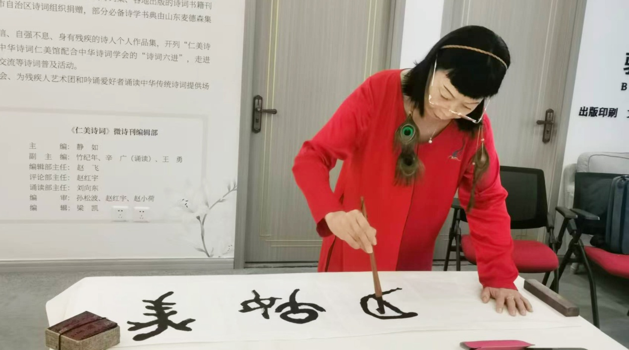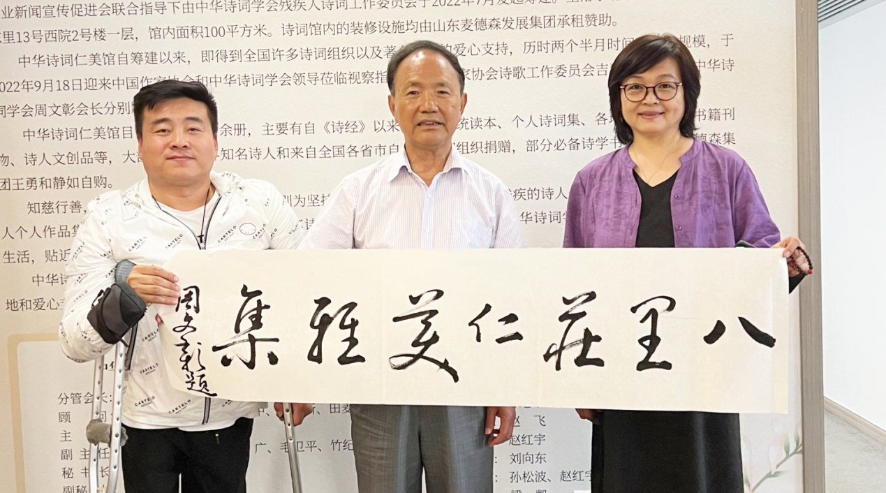 周文彰会长在讲话中对残疾人诗词工作委员会成立三年以来的“送诗词文化到基层”助残惠残工作、残健共融文化交流成就给予充分肯定。他指出,残疾兄弟姐妹不仅需要诗词书画润泽美好生活,更是促进中华诗词文化发展和繁荣的一支力量。他希望以此次活动为契机,在中华诗词学会残疾人诗词工委的带领下,不断创作更好更多作品,推动文化助残事业融入新时代新发展格局。希望各界爱心人士用诗词书画搭建起多种交流平台,在促进残健融合、文化交流与情感沟通的同时,大力弘扬中华传统文化,展现传统诗词与书画艺术的魅力。周文彰会长还为仁美诗词编辑部书写《卜算子》,为“八里庄仁美雅集联句”题签。