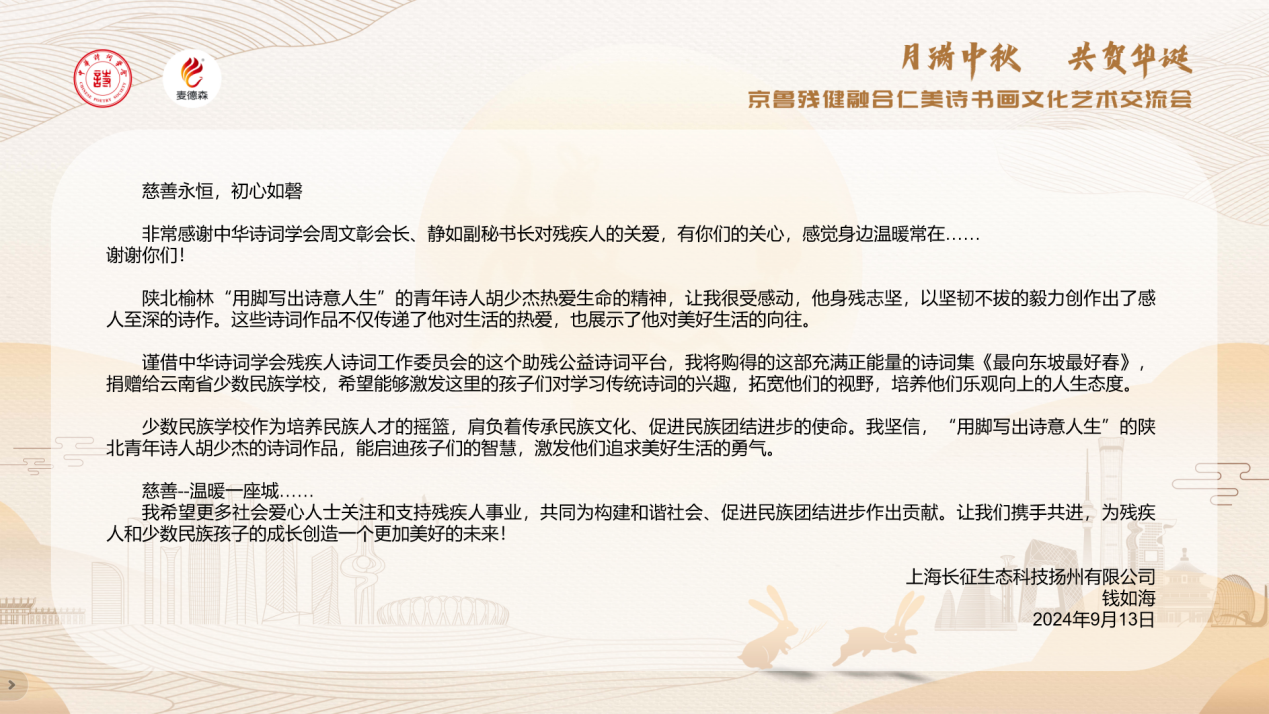 2024年9月14日,“月满中秋 共贺华诞”京鲁残健融合诗书画文化艺术交流活动在中华诗词仁美馆举行。