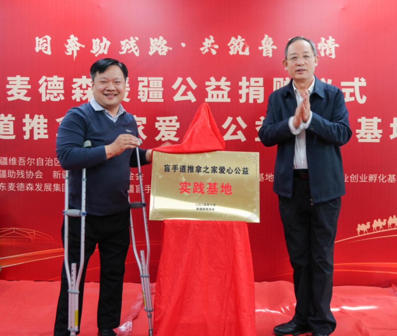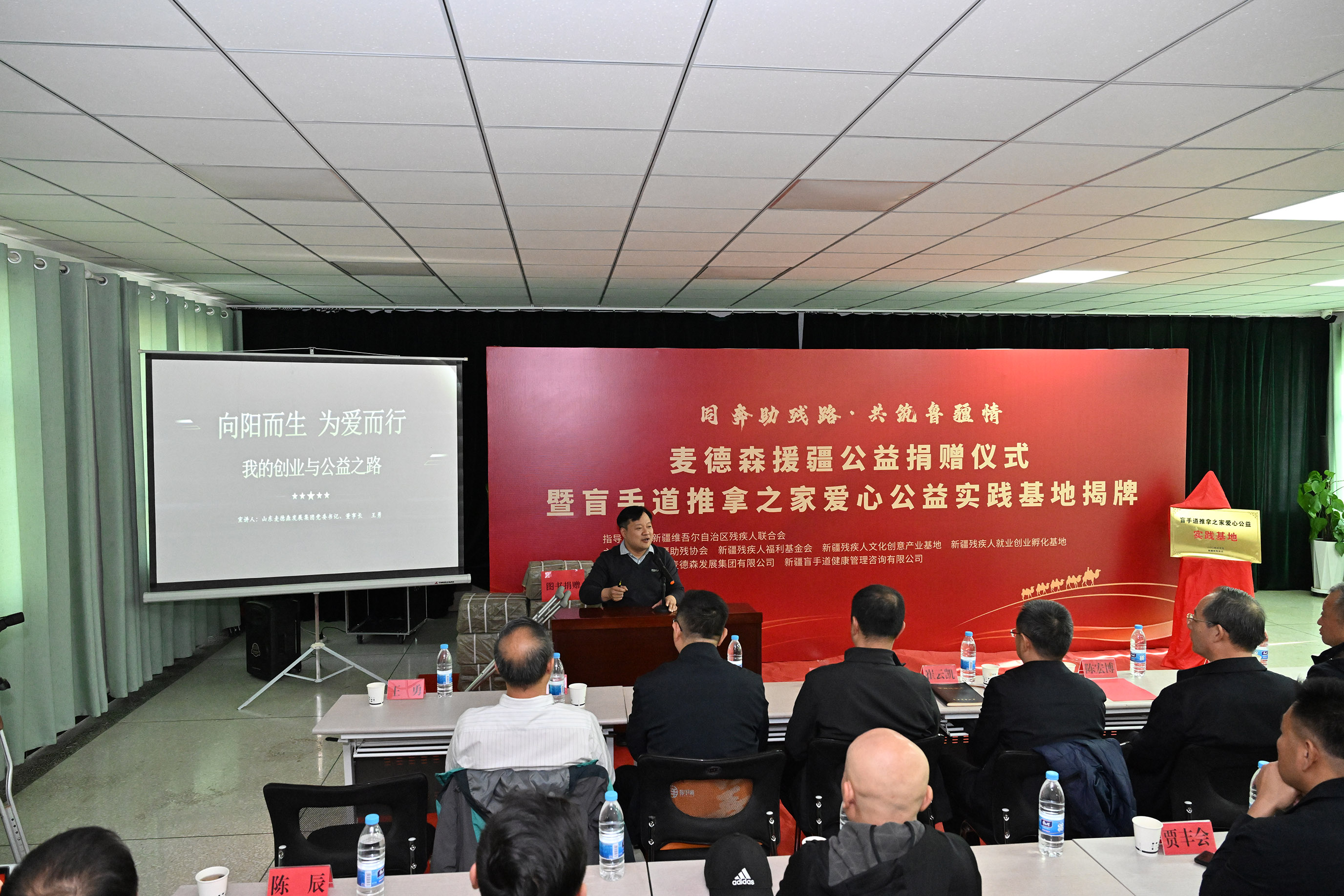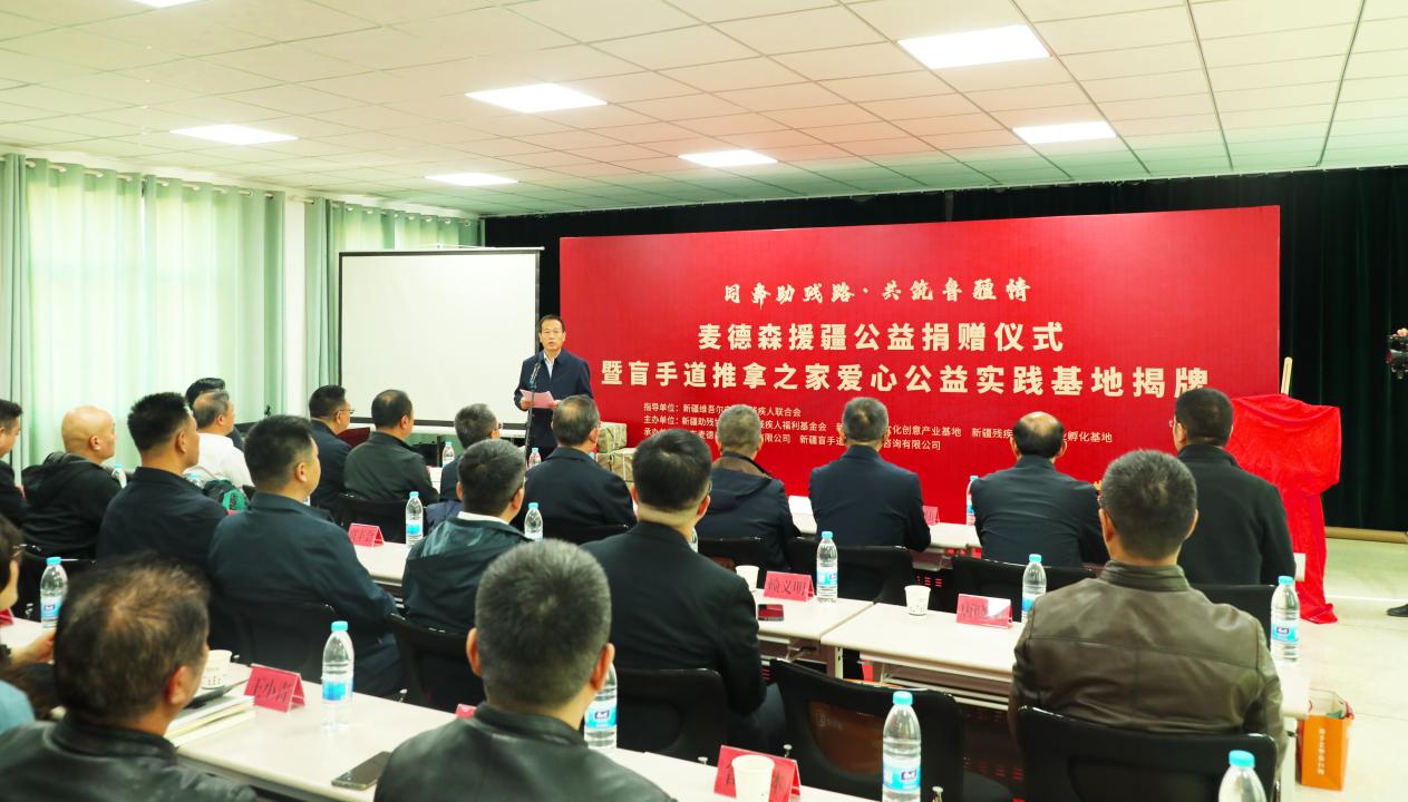 当日,“同奔助残路 共筑鲁疆情”——山东麦德森发展集团援疆公益捐赠仪式暨盲手道推拿之家爱心公益实践基地揭牌活动在乌鲁木齐市新疆残联双创基地六楼大厅举行。