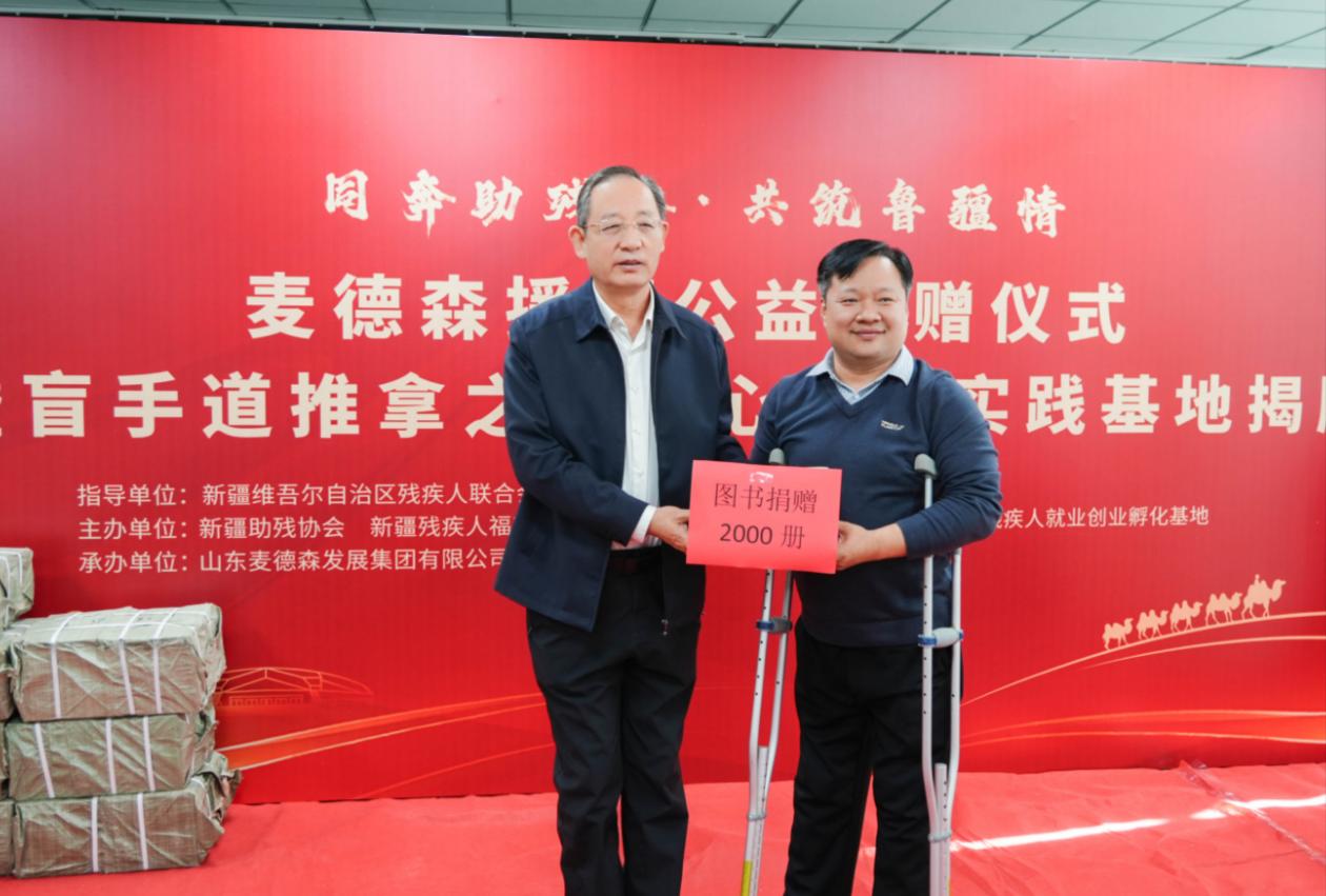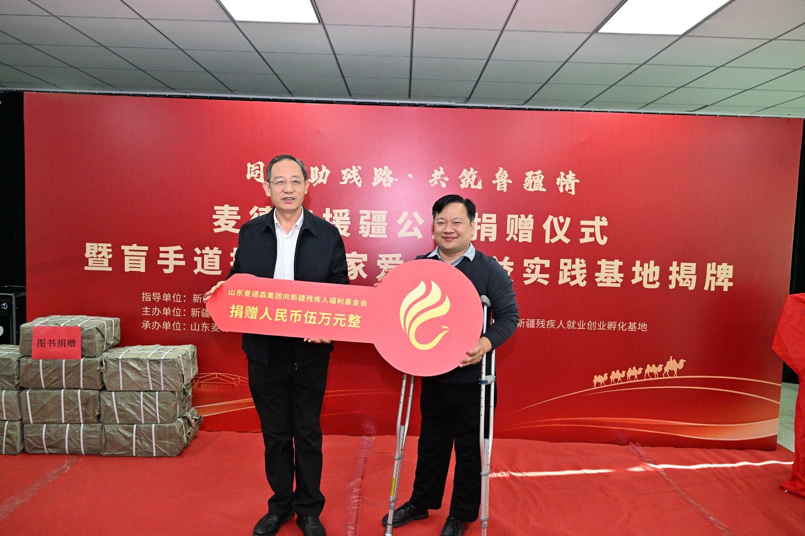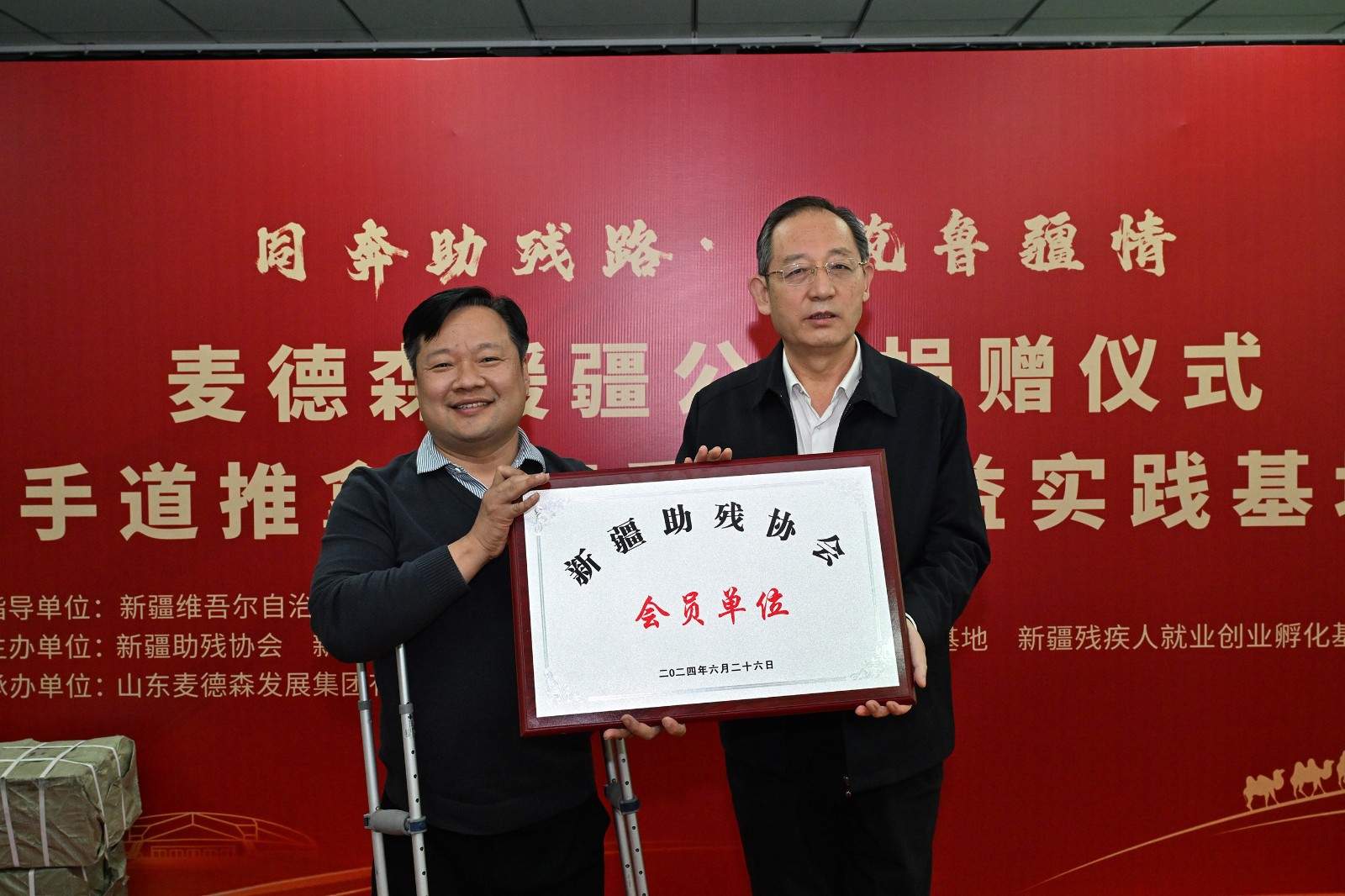 当日,“同奔助残路 共筑鲁疆情”——山东麦德森发展集团援疆公益捐赠仪式暨盲手道推拿之家爱心公益实践基地揭牌活动在乌鲁木齐市新疆残联双创基地六楼大厅举行。