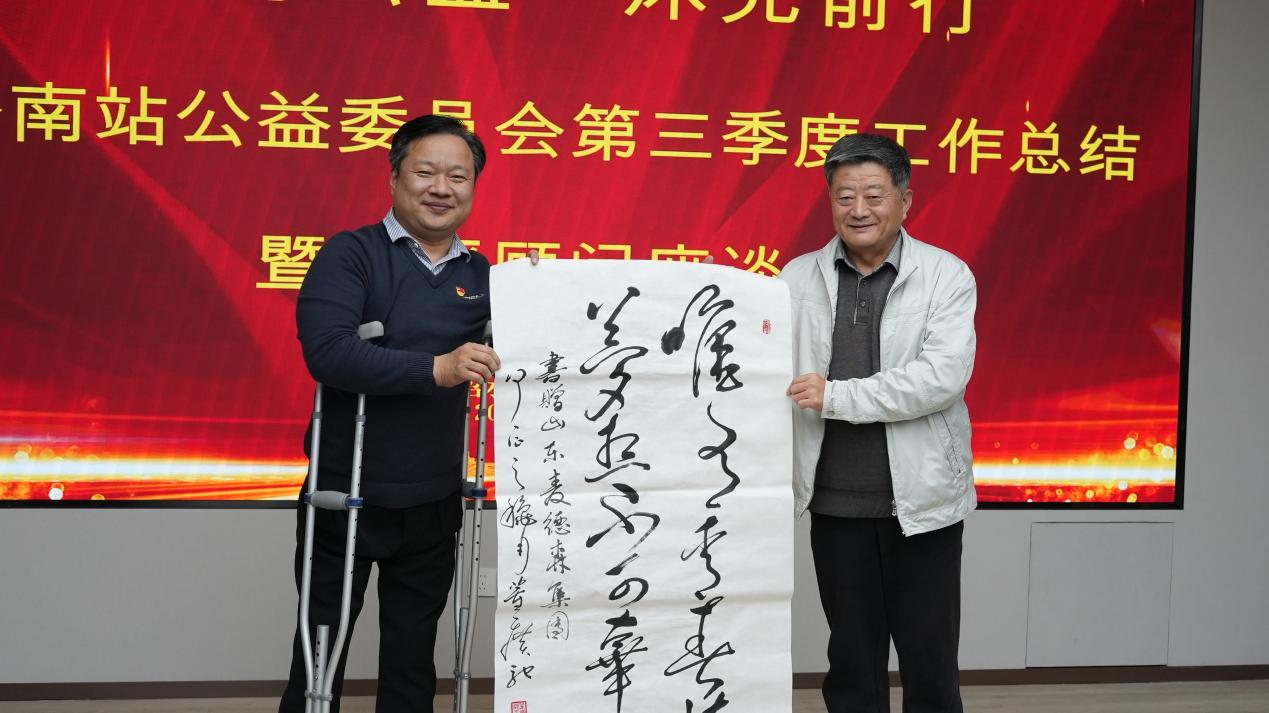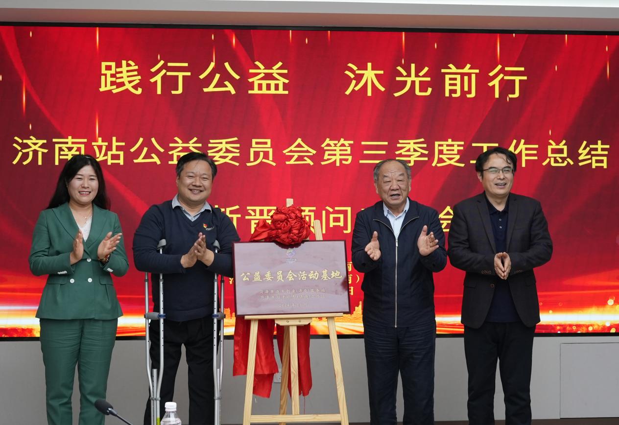 会议现场,济南站新晋顾问欢迎仪式隆重举行;董广驰名誉站长向山东麦德森发展集团赠送“唯有青春与梦想不可辜负”书法墨宝;王勇书记与夏鲁青名誉站长、赵庆民站长、晁玉萍秘书长共同为济南站公益委员会活动基地揭牌。