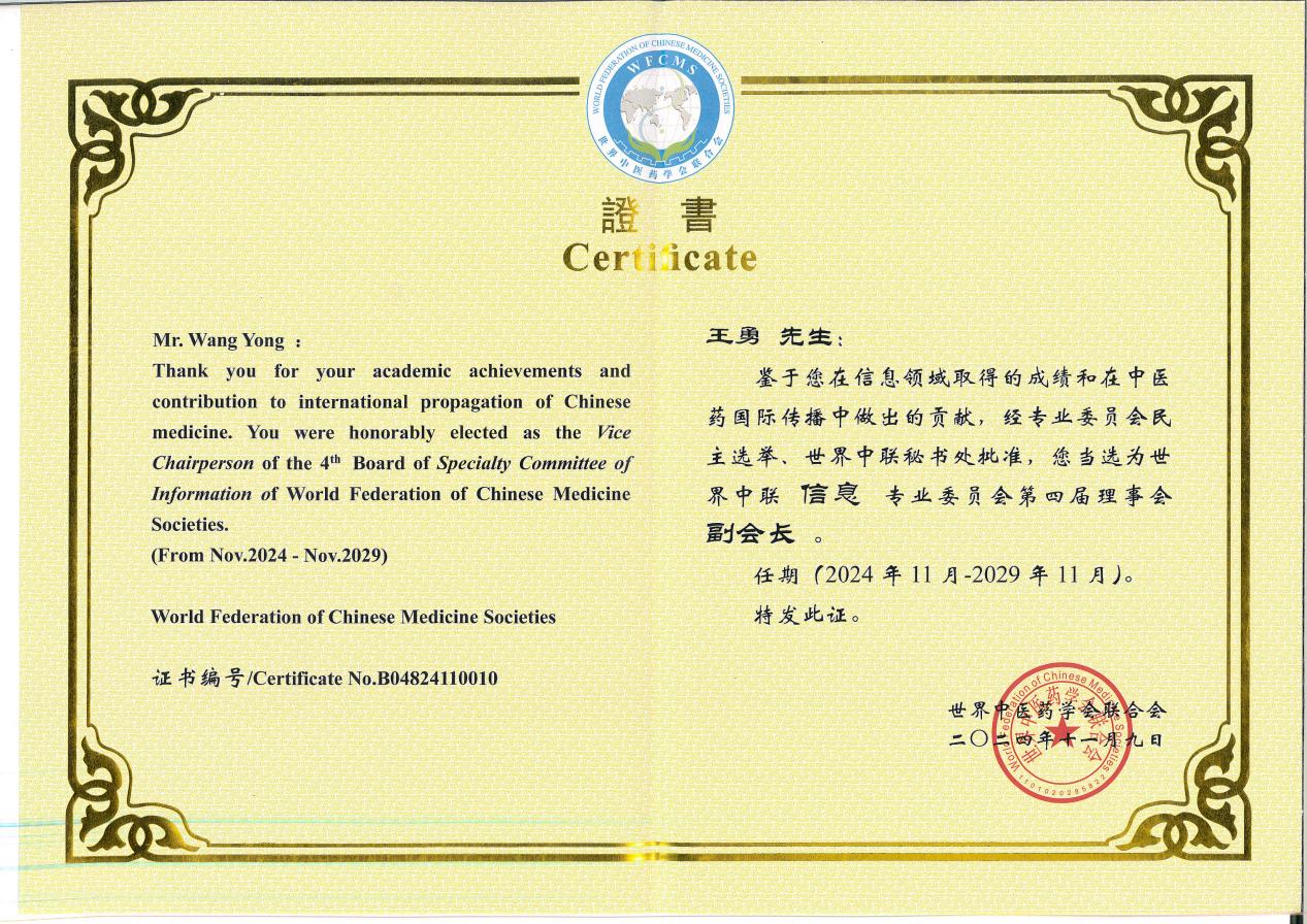 王勇书记当选世界中医药学会联合会信息专业委员会副会长