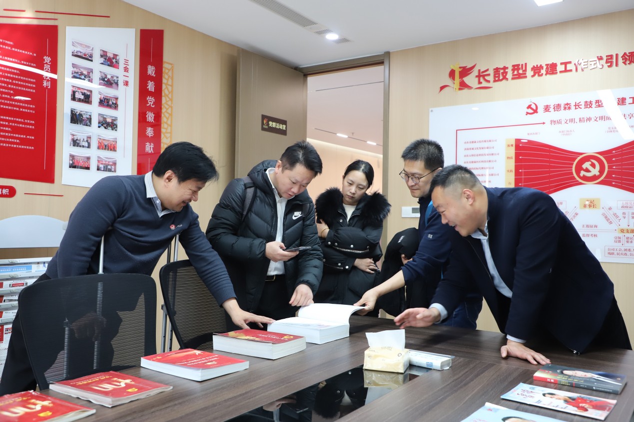 在王勇的引导与讲解下,金盾出版社一行走访参观了“凤凰于飞,与党同行”——“两新组织”麦德森党建图片展以及各产业部门,并详细了解麦德森“长鼓型”党建工作式及党建引领企业高质量发展进程。