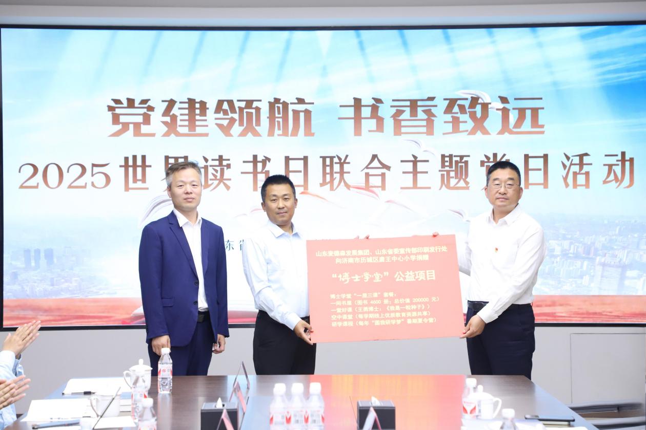 同时,山东省委宣传部印刷发行处处长刘洪河与集团执行董事王兴法共同向济南市历城区唐王中心小学捐建第24所“博士学堂”,打造公益书屋,点亮更多孩子的阅读之光。