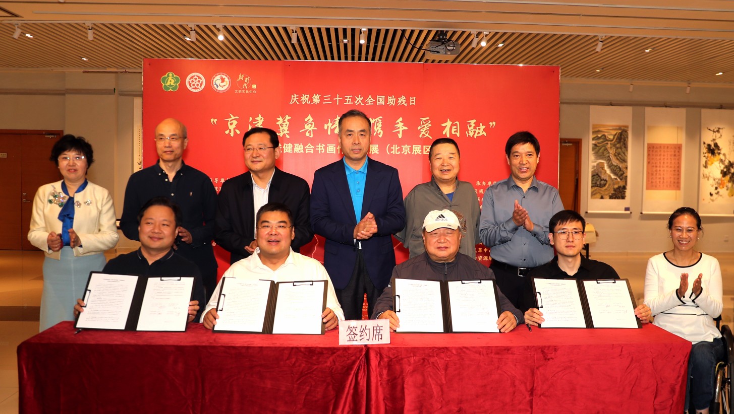 活动现场,王勇书记与北京、天津、河北三地肢协领导共同签署“京津冀鲁情 携手爱相融”书画联展意向书,标志着四地将建立长期合作机制,通过书画艺术交流平台促进残疾人文化事业资源共享、人才共育,推动残健融合向更高水平发展。