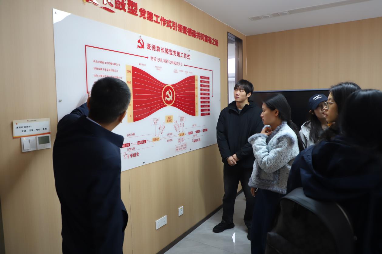 活动前,同学们参观了麦德森党群活动室、“铭记百年党史,汲取奋进力量”中共山东百年历史图片展、“凤凰于飞,与党同行”——“两新组织”麦德森党建图片展以及各产业部门办公区域,对集团党务工作,史志出版、“博览医书”中医药大数据等产业板块进行详细了解。