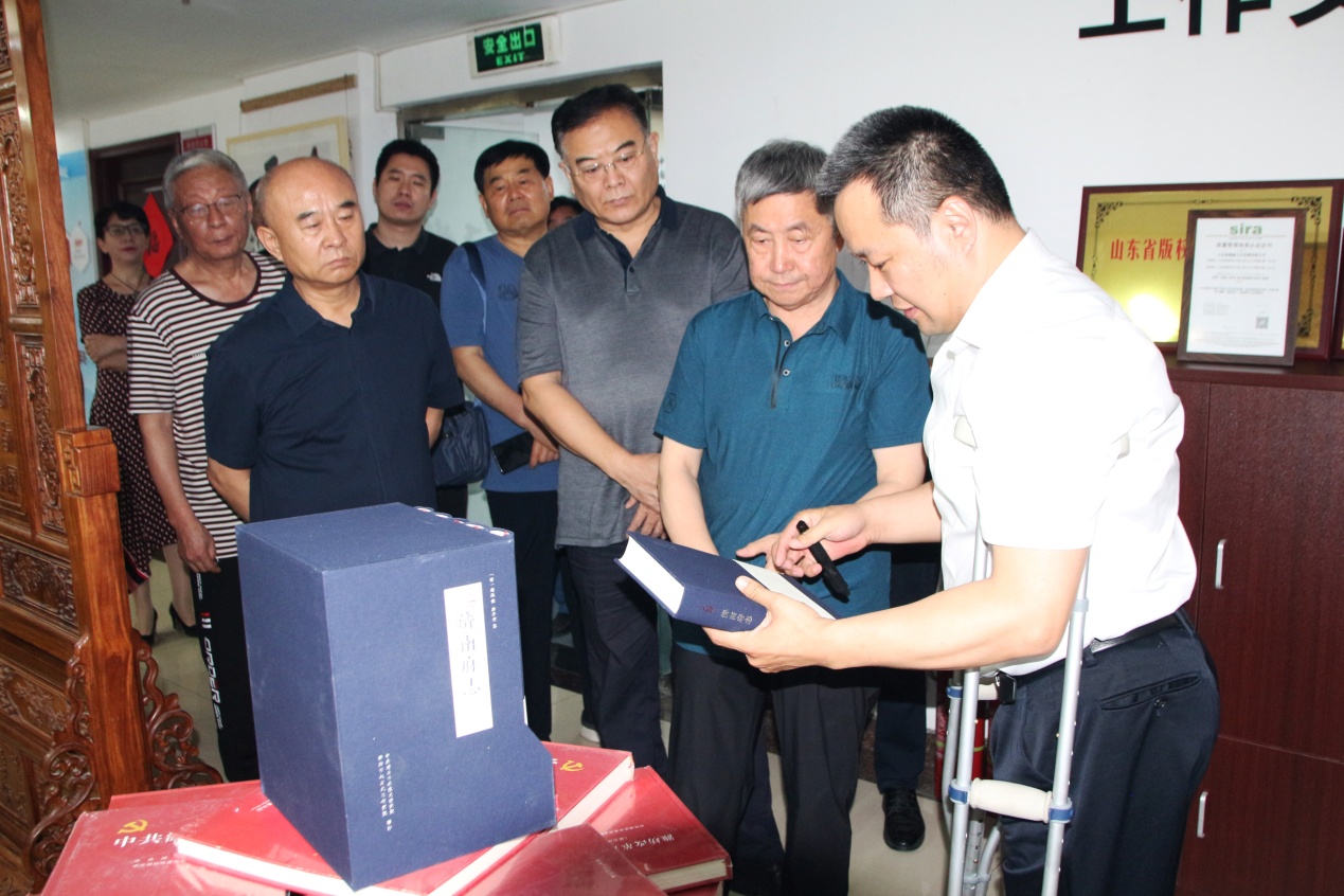王勇博士向各位领导介绍我集团承印的康熙《济南府志》。该府志不仅具有“存史、资政、教化”的价值,更是赓续与传承济南历史文脉的重要文献,受到了济南市委、市政府的高度认可。