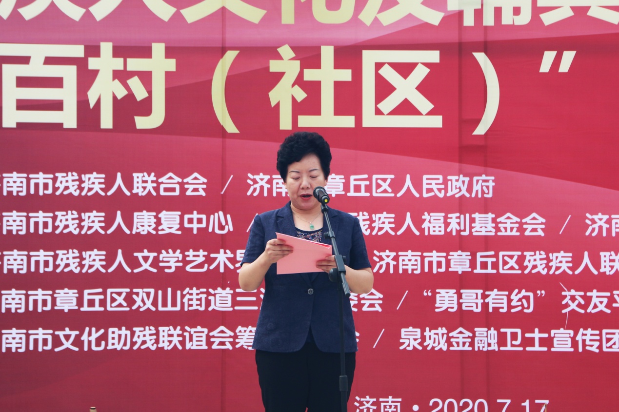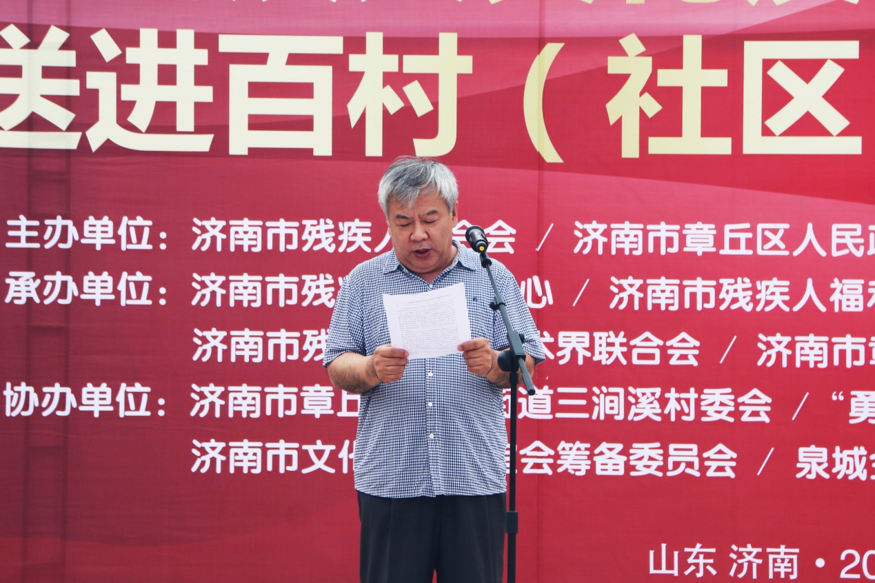 章丘区副区长王玉洁在致辞中详细介绍了此次“双送进百村(社区)”活动的筹备工作,市残联副理事长曲国庆在讲话中指出,“文化共享”以残疾人及人民群众喜闻乐见的形式,宣传党的惠残政策、讲述“济南残疾人故事”;“辅具适配服务”不仅减轻了残疾人家庭的生活负担,也为他们走出家门、融入社会提供了便利条件。