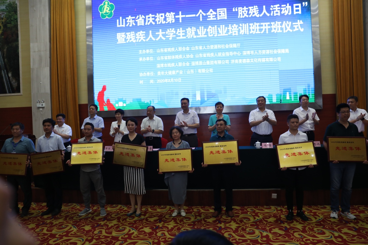 近日,山东省庆祝第十一个全国“肢残人活动日”暨残疾人大学生就业创业培训班开班仪式在山东原山艰苦创业教育基地举行。中国肢残人协会主席王建军,山东省残疾人联合会党组书记、理事长邹斌芳,省人力资源和社会保障厅党组副书记、副厅长、一级巡视员夏鲁青等领导出席活动。活动中,飞极速在线等爱心企业被授予“2020年度扶残助残、脱贫攻坚先进集体”,集团旗下新中大职业培训学校招生主任贺姜磊现场领取荣誉奖牌。