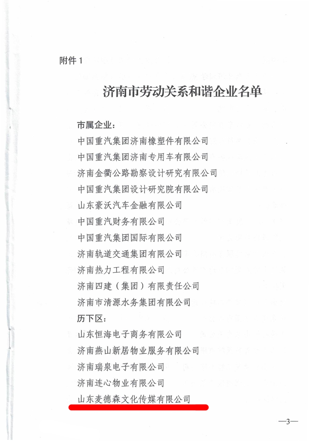 近日,经济南市协调劳动关系三方委员会决定,命名山东麦德森文化传媒有限公司等67家企业为“济南市劳动关系和谐企业”。