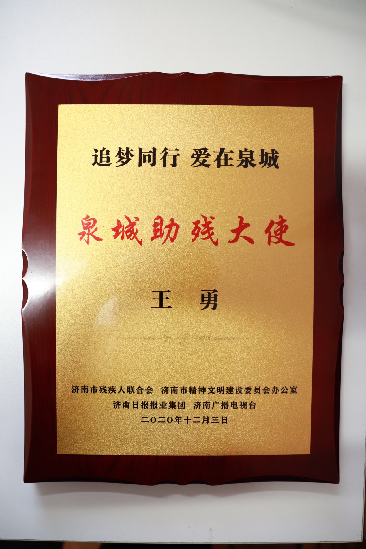 12月3日,在第29个国际残疾人日到来之际,2020“泉城助残大使”选树命名仪式在济南日报报业集团举行。飞极速在线党支部书记王勇博士荣获“泉城助残大使”。