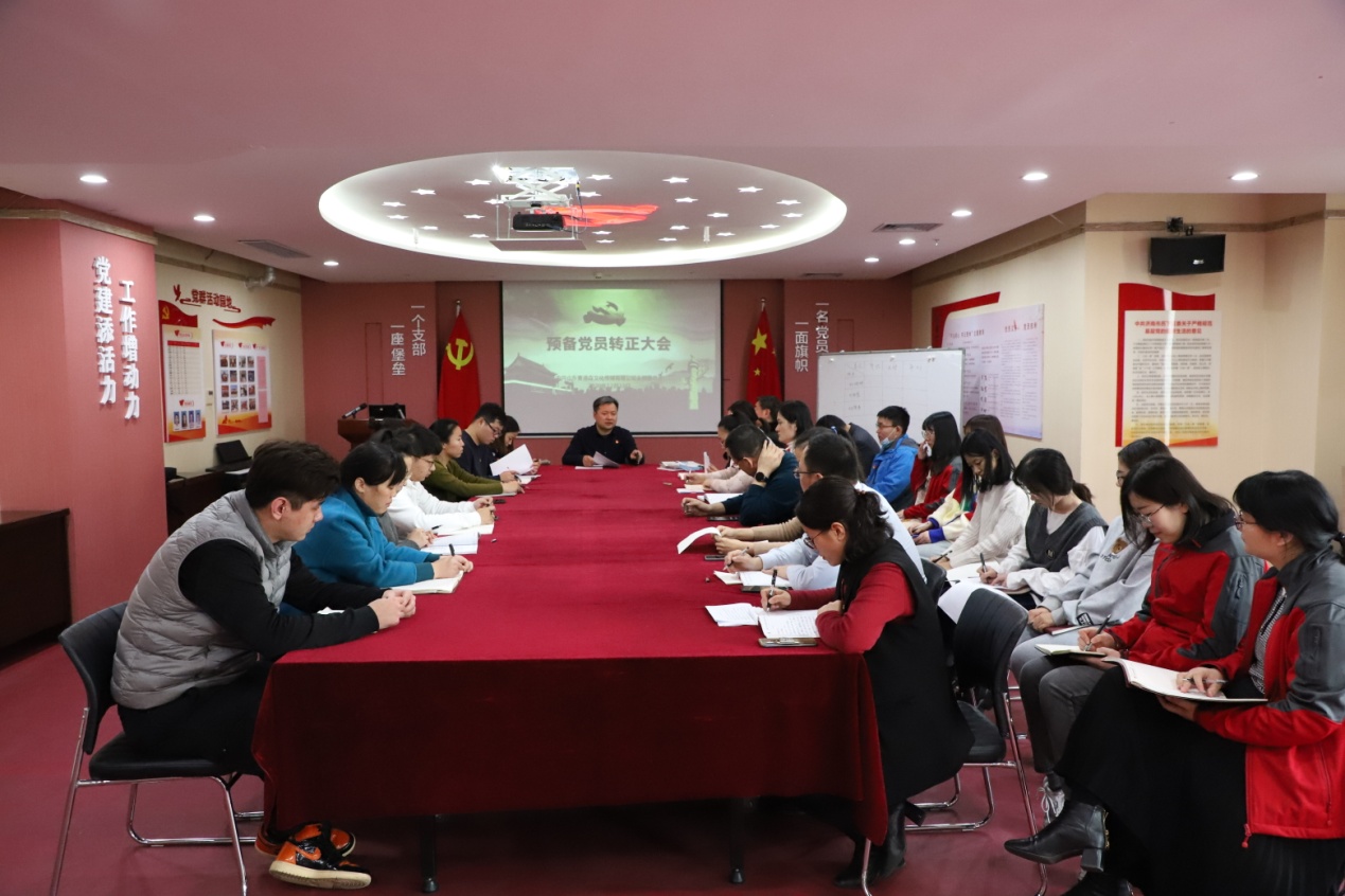 按照预备党员转正程序,首先,转正申请人向大会汇报了自己预备期间的思想、学习、工作等方面的表现,表达了自己对党热爱与忠诚,并提出转正申请;其入党介绍人向大会汇报了转正申请人在预备期的培养考察情况,同时参会党员充分发表个人关于对其转正的意见。