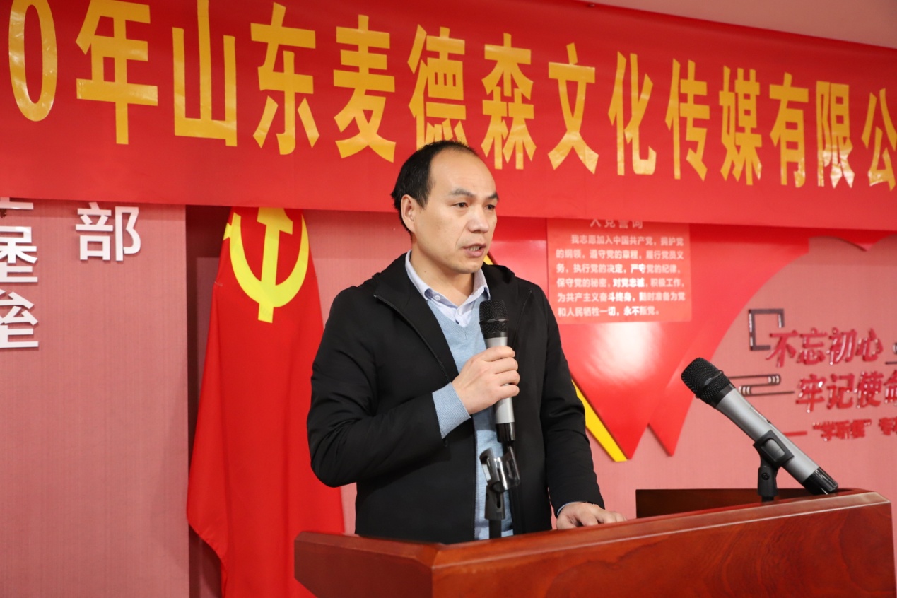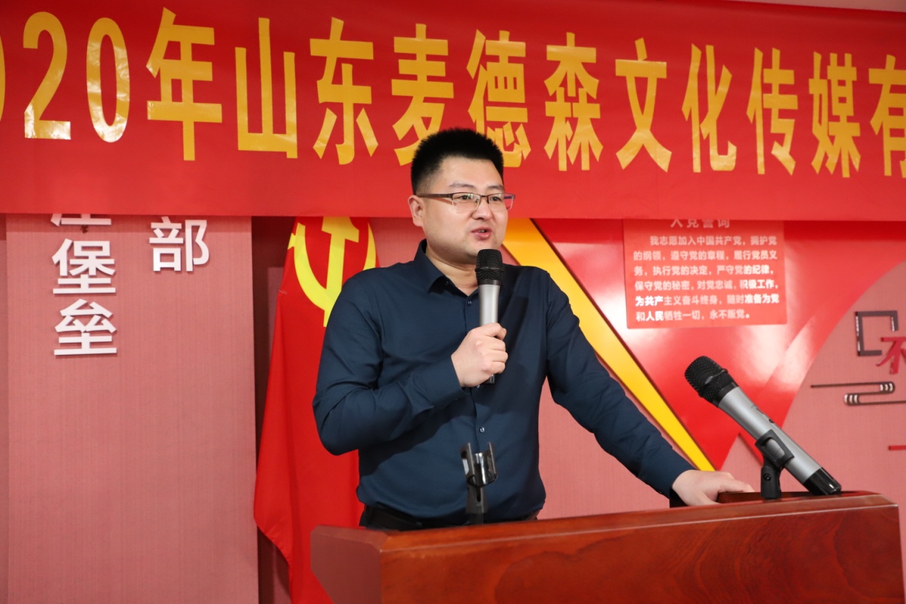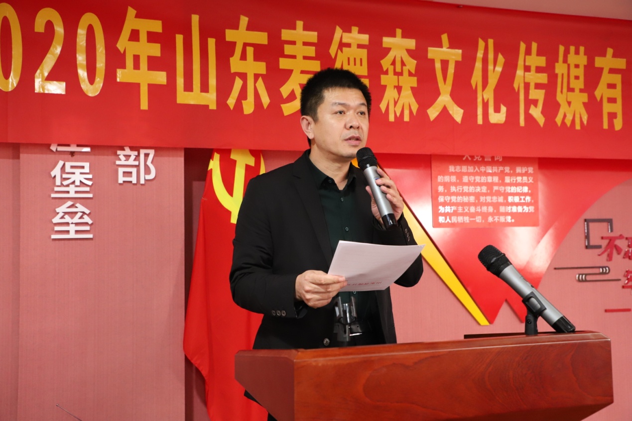 集团党支部副书记桑守正宣读《关于表彰2020年度山东麦德森文化传媒有限公司最佳优秀作品、第四季度和年度销售冠军的通报》
