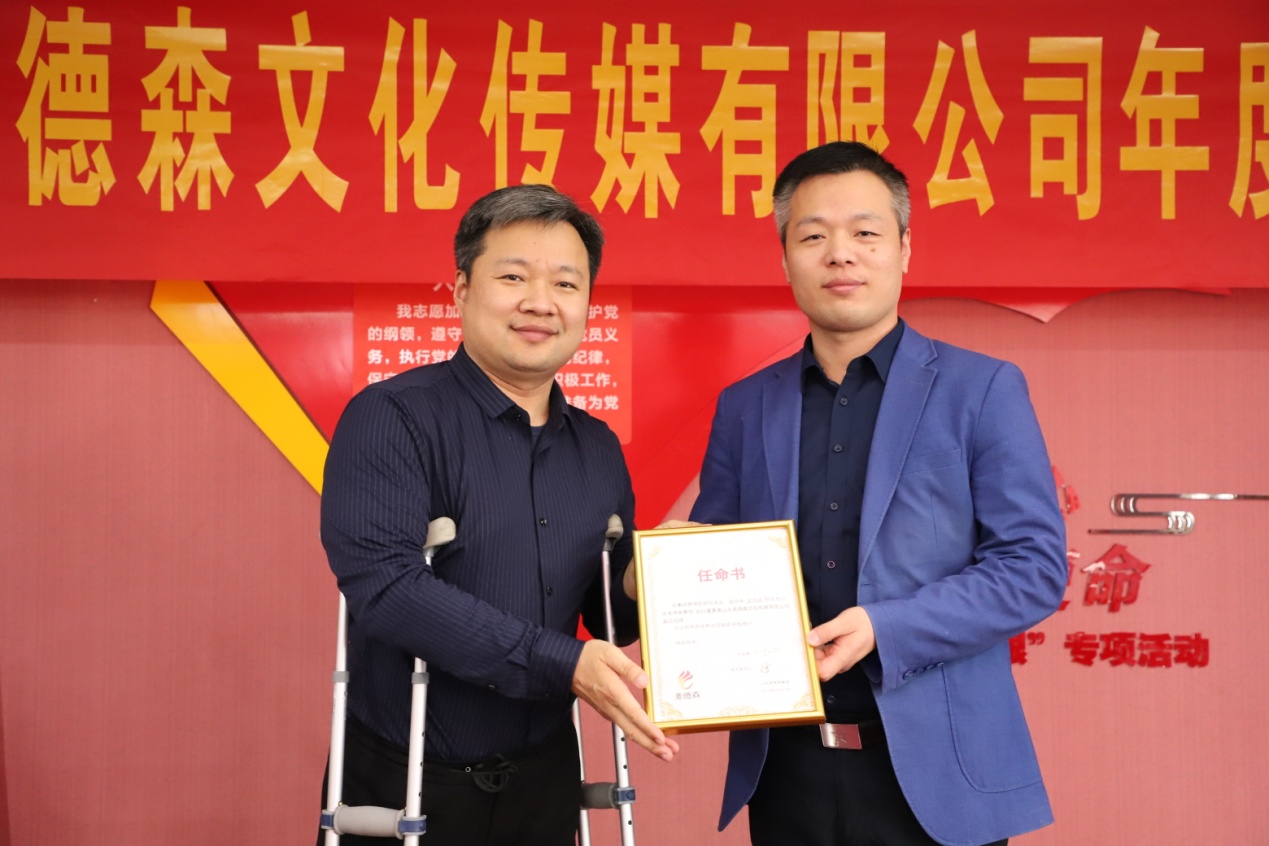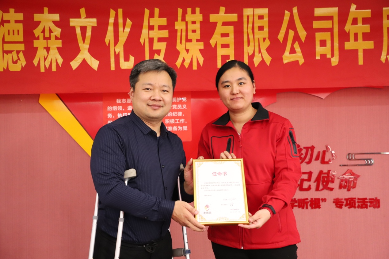 会上,山东麦德森文化传媒有限公司总经理张永华、出版印刷中心总经理闫金峰作年度总结。集团总经理张天君宣读了山东麦德森文化传媒有限公司机构改革方案及有关人事任命决定,集团党支部书记王勇博士为麦德森集团执行董事兼山东麦德森文化传媒有限公司副总经理王兴法、办公室主任张安霞、印刷部主任张盟、排版设计编辑部主任孙静静颁发任命书。