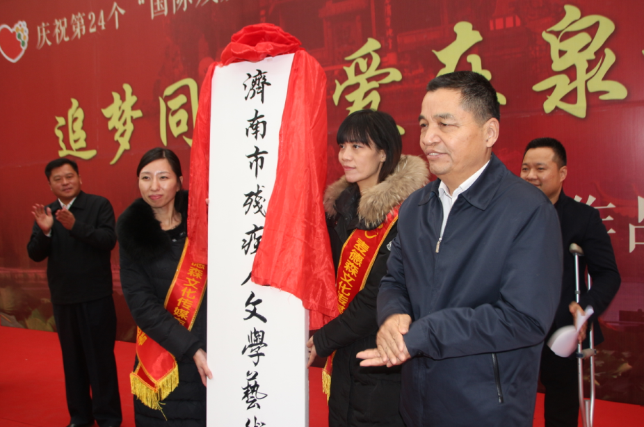 仪式首先由市残联副巡视员刘红卫简要介绍了成立济南市残疾人文联的相关情况,其次由市文联党组书记、副主席刘溪就市残疾人文联成立致贺辞,市残联党组书记、理事长孙君涛为市残疾人文联顾问颁发聘书,市委常委、市总工会主席、市残联主席团主席王以才为“济南市残疾人文学艺术界联合会”揭牌。最后由公司董事长、济南市残疾人文联首届主席王勇发表致辞。