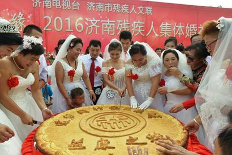 济南市益康食品厂为本次集体婚礼专门制作了一个非常特殊的礼物——印制有济南残联精神“追梦同行 爱在泉城”,直径118厘米的特大型月饼。这个特制的圆圆的特殊礼物,承载着泉城的爱心,满载着圆残疾人婚礼梦的助残善行,象征着社会各界对残疾人美满幸福婚姻的甜蜜祝福!至此,在社会的关爱关怀之下,13对新人享受了一场仪式简约、场面隆重、规格高端、终生难忘的集体婚礼。济南电视台生活频道总监宫照光、济南市残疾人文联主席王勇为新人证婚,济南市残联副巡视员、济南市残疾人文联名誉主席刘红卫担任主婚人,并为新人赠送礼品。