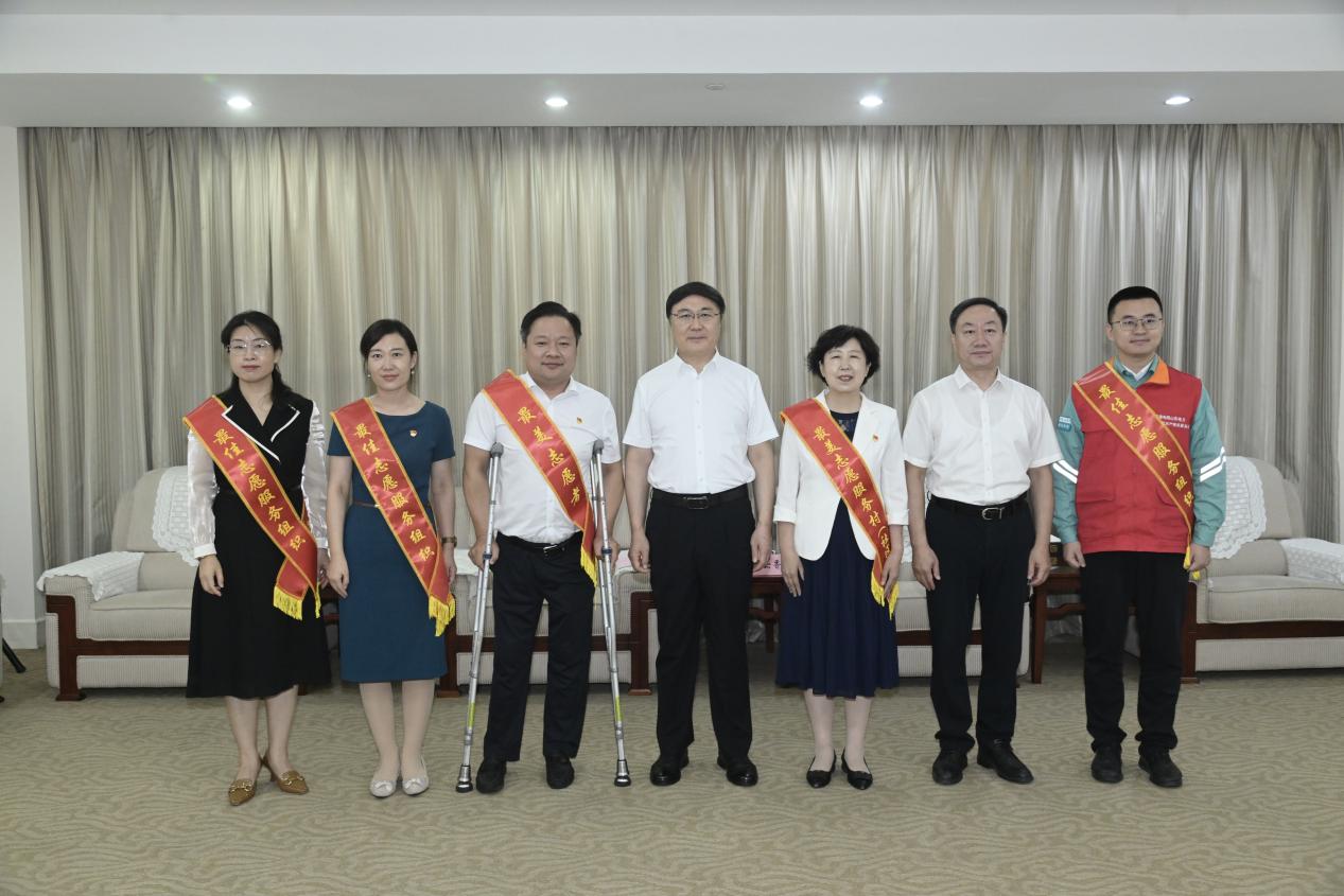 宣讲开始前,济南市委副书记杨峰在龙奥大厦接待室亲切会见了2024年度全国志愿服务“四个100”先进典型代表,对他们取得的荣誉表示热烈祝贺,并勉励大家继续发挥榜样作用,弘扬志愿精神。