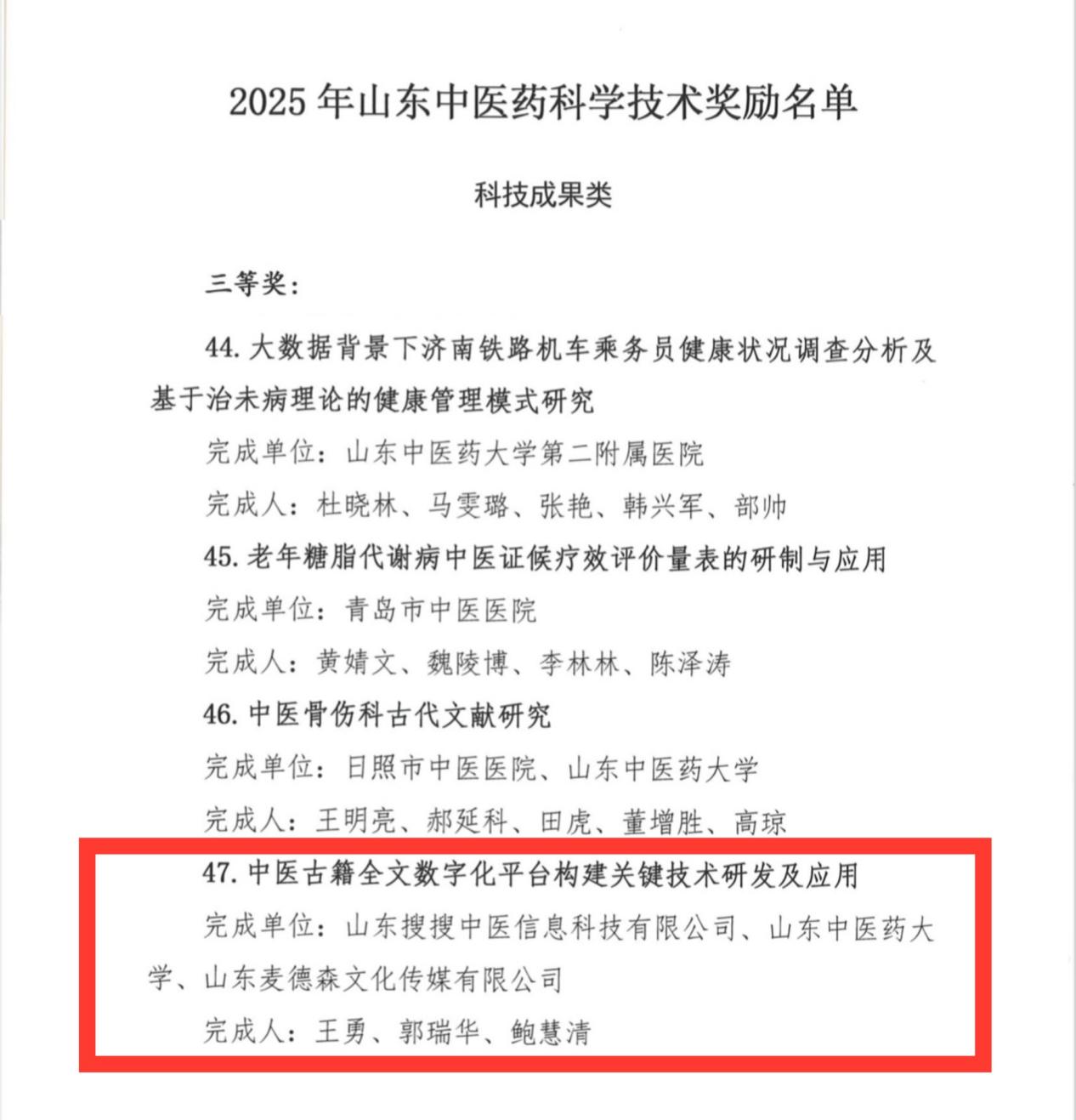 日前,山东中医药学会正式公布2025年度山东中医药科学技术奖获奖名单。由山东麦德森发展集团旗下山东搜搜中医信息科技有限公司、山东麦德森文化传媒有限公司与山东中医药大学联合完成的“中医古籍全文数字化平台构建关键技术研发及应用”项目,荣获科技成果类三等奖。