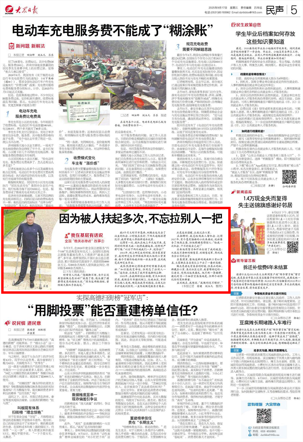 9月17日,《大众日报》在“我在基层有话说”专栏以《因为被人扶起多次,不忘拉别人一把》为题,刊发了对全国阳光助残志愿服务基地负责人、山东麦德森发展集团党委书记、董事长王勇的深度报道。