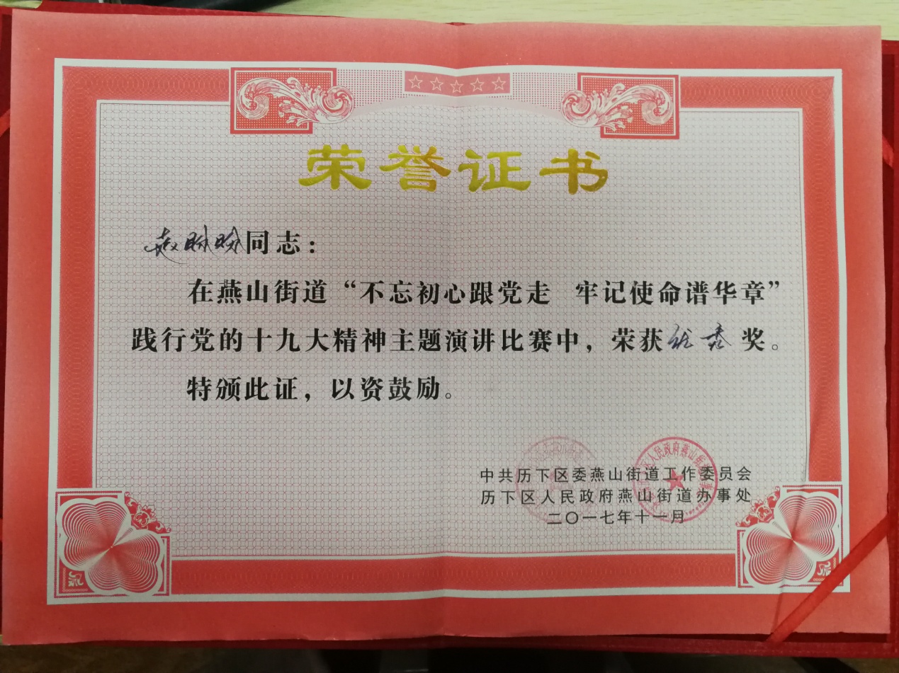 为深入学习贯彻党的十九大精神,按照区委组织部、宣传部、团区委的活动部署,充分展示新时代燕山青年朝气蓬勃、奋发有为的精神状态,激发全办青年干部职工埋头苦干、锐意进取的工作热情,筑梦想、谱华章,在首善之区建设中贡献青春力量,11月23日,街道党工委在全办举行“放飞青春筑梦想 建功历下谱华章——燕山街道践行党的十九大精神主题演讲”比赛。我集团赵盼盼同志代表公司参加演讲比赛荣获优秀奖。