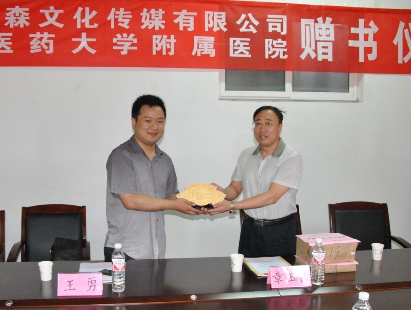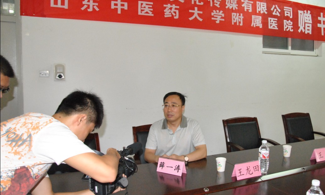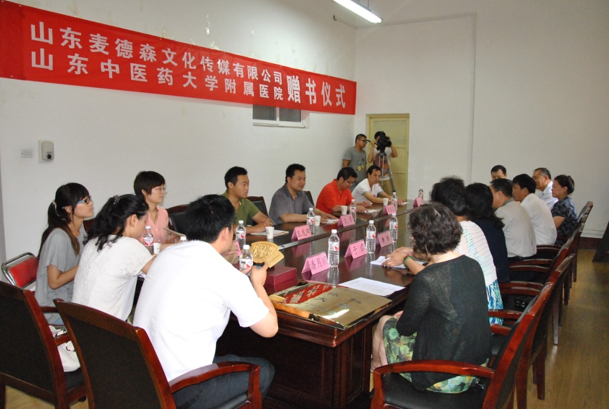 2012年8月3日上午9时,适逢盛夏喜雨。我公司董事长王勇携公司高层向母校山东中医药大学附属医院(山东省中医院)捐赠700余册价值共计8万余元的图书活动仪式在附院图书馆会议室举行,山东中医药大学第一附属医院李伟院长主持,附院薛一涛副院长、党办、院办、宣传部、医务部、教学管理处等领导参加了本次活动。出席本次活动还的还有山东电视台、济南时报等媒体。
