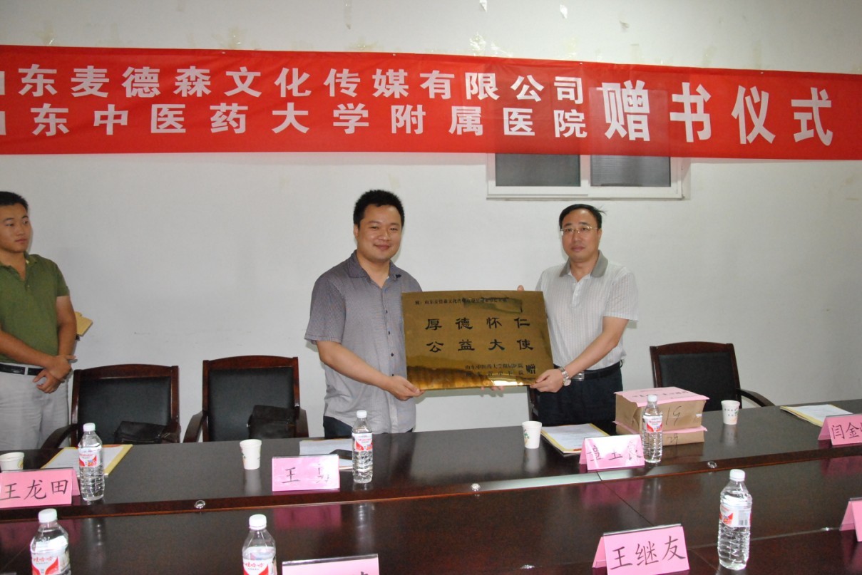 随后,李伟副院长主持了本次捐赠的仪式:由王勇董事长代表麦德森文化传媒有限公司向山东中医药大学第一附属医院捐赠图书。薛、副院长代表山东中医药大学附属医院向王勇董事长赠送了“厚德怀仁,公益大使”牌匾和山东中医药大学第一附属医院50周年院庆纪念品。仪式结束后,省中医院薛院长带领王勇董事长参观附院图书馆建设,并引导王勇董事长参观学校本部。