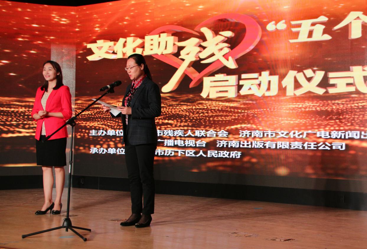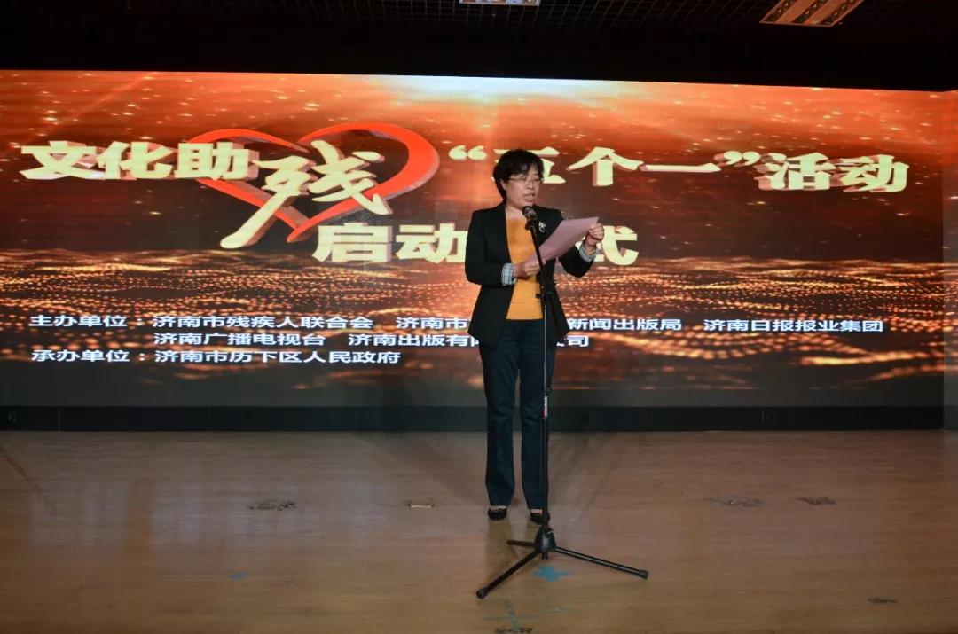 4月3日上午,由济南市残疾人联合会、济南市文化广电新闻出版局、济南日报报业集团、济南广播电视台、济南出版有限责任公司共同主办的济南市文化助残“五个一”活动在历下区文化中心正式启动。济南市文广新局党委书记、局长李守海,济南市残联党组书记、理事长孙君涛,济南广播电视台党委书记、台长孙世会,济南出版有限责任公司党委书记、董事长崔刚,历下区人民政府副区长丁晓红等领导出席此次活动。我集团董事长、济南我的兄弟姐妹艺术团团长、济南市残疾人文学艺术界联合会主席王勇参加此次活动。