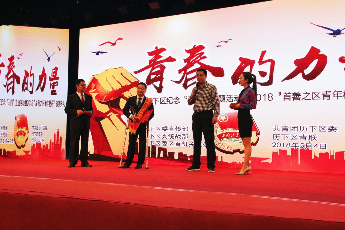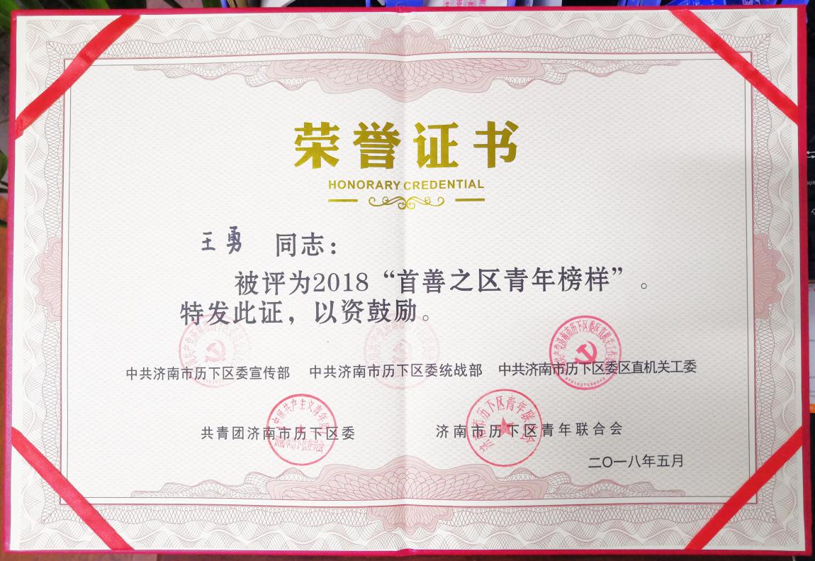 为更好地学习贯彻党的十九大精神和习近平新时代中国特色社会主义理论,深入推进“勇做夺标突击手,争当济南第一团”活动, 5月4日上午,纪念“五四”主题活动暨“2018首善之区青年榜样”颁奖典礼在历下大厦隆重举行。历下区委副书记尹红梅,区委常委、组织部部长续明,区委常委、统战部部长杜宝现,副区长丁晓红,区政协副主席房玉萍等领导出席本次活动。我集团董事长王勇在本次活动中荣获2018“首善之区青年榜样”荣誉称号。