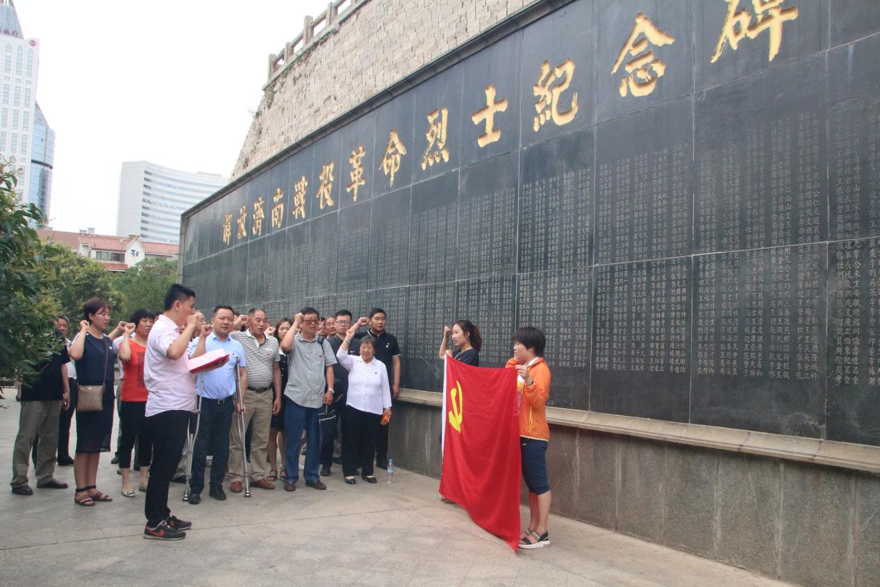 站在济南战役革命烈士纪念碑前,面对鲜红的党旗,参加活动的全体人员高举右手庄严宣誓,一起重温入党誓词,向革命先烈们致以崇高的敬意,表达了自己不忘初心,愿为党的事业奋斗终身的决心。