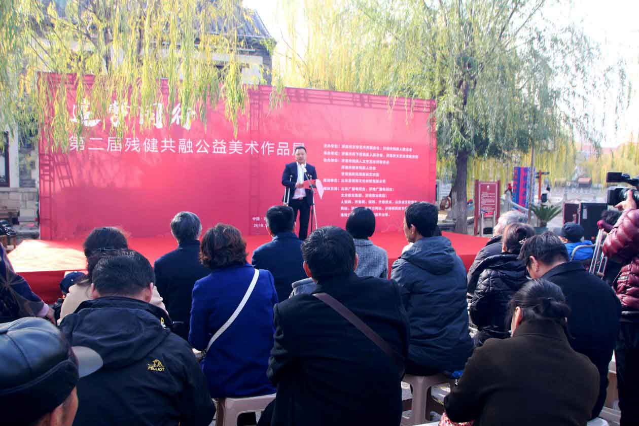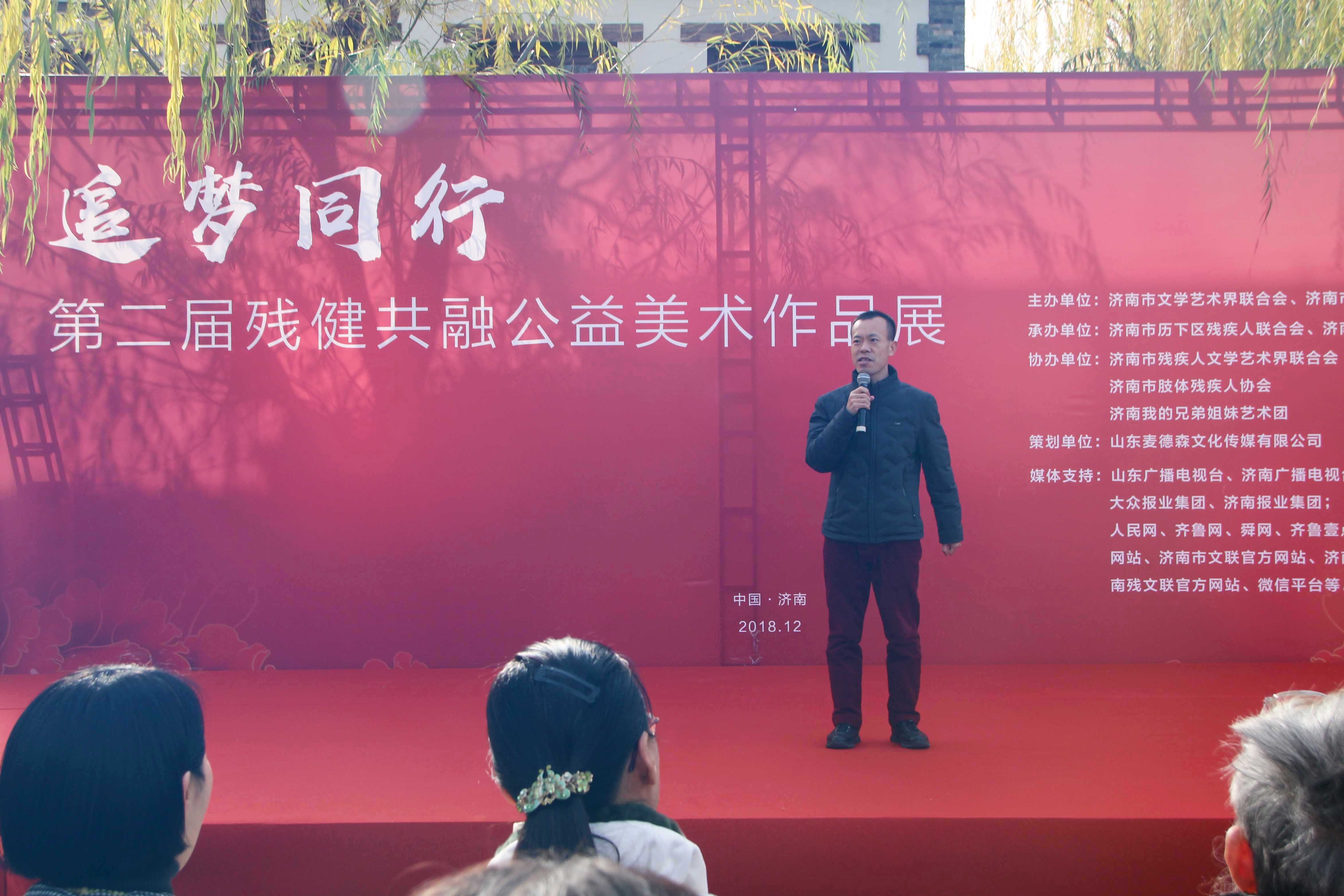 开幕式上,济南市残联主席团副主席、济南市残疾人文联主席、飞极速在线董事长王勇进行致辞,介绍了本次公益展览活动全程策划情况,并表示将继续坚定“文化助残、精神扶贫”的理念,帮助更多的优秀艺术家、培养出更多的优秀人才。