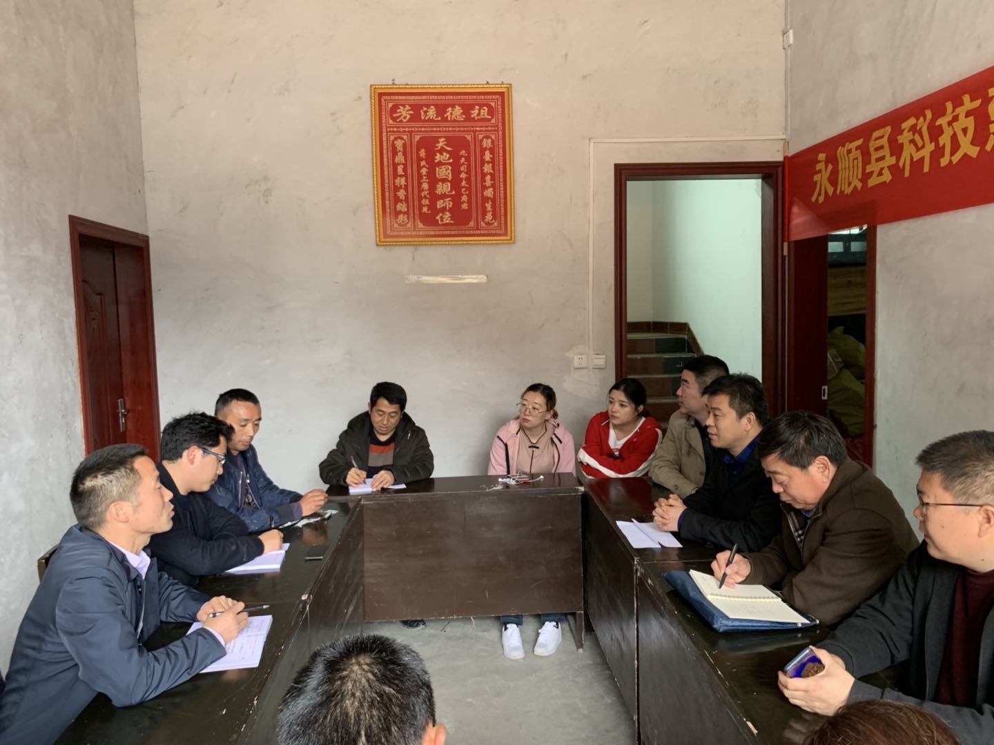 在洞坎河村村部,考察组与村委班子就此次扶贫工作展开座谈。座谈会上,向书记向大家介绍了洞坎河村的优势和特色,并提出了扶贫工作中遇到的困难和需求。