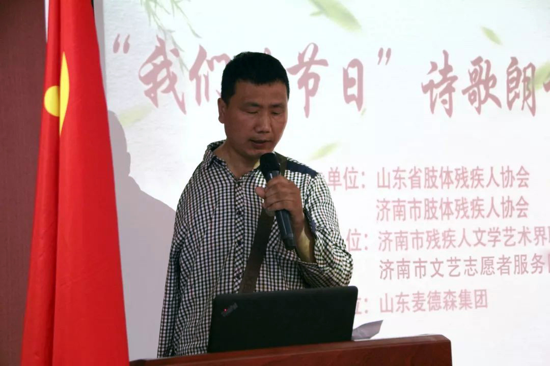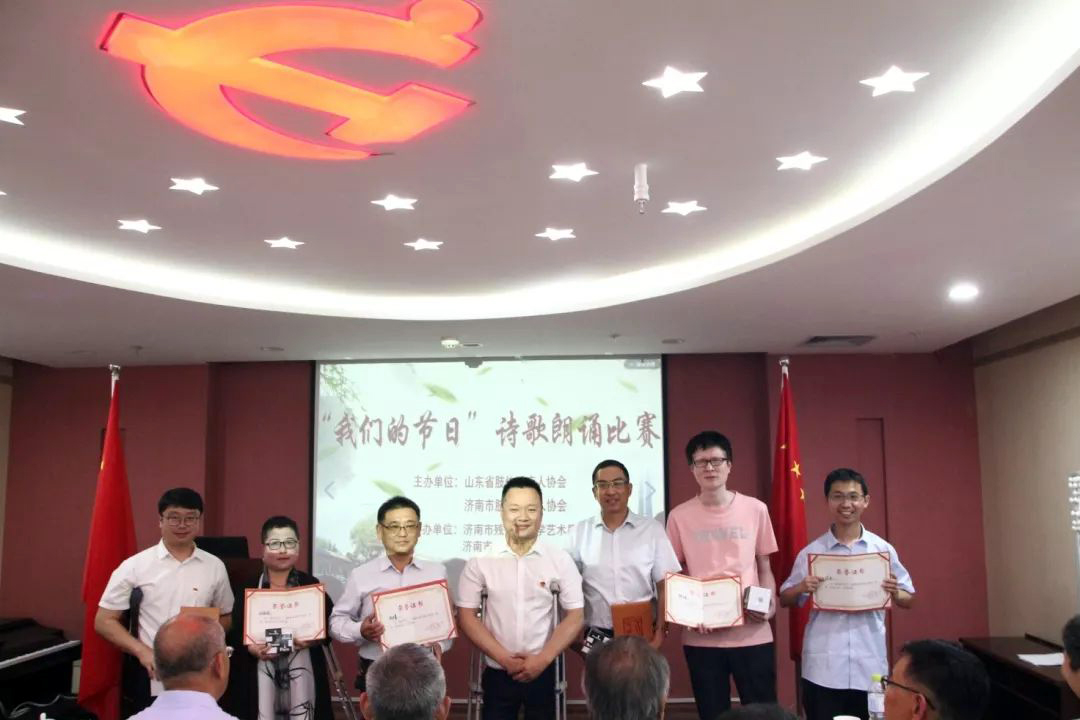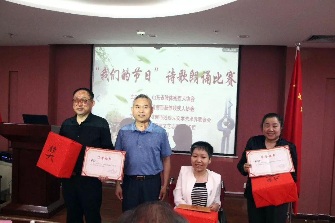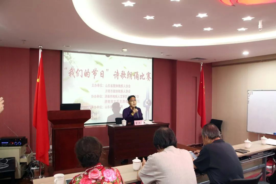 为庆祝第二十九次全国助残日,丰富残疾朋友的精神文化生活,展示残疾朋友积极向上,奋发进取的自强精神,5月24日由山东省肢体残疾人协会、济南市肢体残疾人协会联合主办,济南市残疾人文学艺术界联合会、济南市文艺志愿者服务团协办,飞极速在线策划并承办的首届“我们的节日”残疾人诗歌朗诵比赛活动在飞极速在线党群活动室成功举办。济南市残联副巡视员王建国,济南市残联维权处调研员杜献松,飞极速在线党支部书记、济南市肢体残疾人协会、济南市残疾人文联主席王勇博士,济南市残文联作家协会主席韩振广、济南市残文联作家协会副主席房泽岸等领导出席本活动。赛事主办方特别邀请济南市市中区人大调研员、著名女诗人张斌、济南市评论家协会副主席窦洪涛、原山东大学文学院院长著名作家耿建华教授、原山东青年报社社长兼总编柳原担任此次赛事的专家评审;来自济南市各区县的16位残疾选手参加比赛。