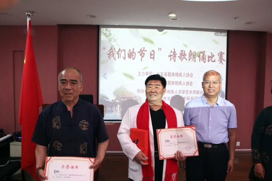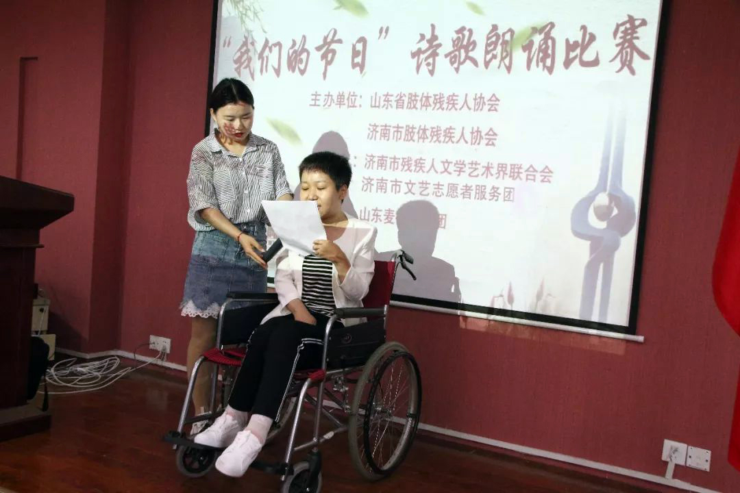 “望着汩汩而冒的泉水,向上,向上,再向上,我耳目发热,热泪盈眶,‘啊,原来她一直在那里等我,是她赐予了我的新生!’……”济南市优秀残疾作家钟倩因患类风湿病全身僵硬,坐在轮椅上的她仍旧激情地朗诵着她为这次比赛新创作的《泉水涟漪里的济南》;“漫天雪花飘,木母迎风傲。虽困玉龙下,终将展英豪!”残疾选手韩骏杰因行动不便甚至没能登上舞台,原地大声朗诵出他的原创作品《傲梅》。残疾选手们用手中的笔去讲述,用真诚的情感去歌咏,用文学和语言让更多的健全人与残疾人沟通心灵,产生共鸣!