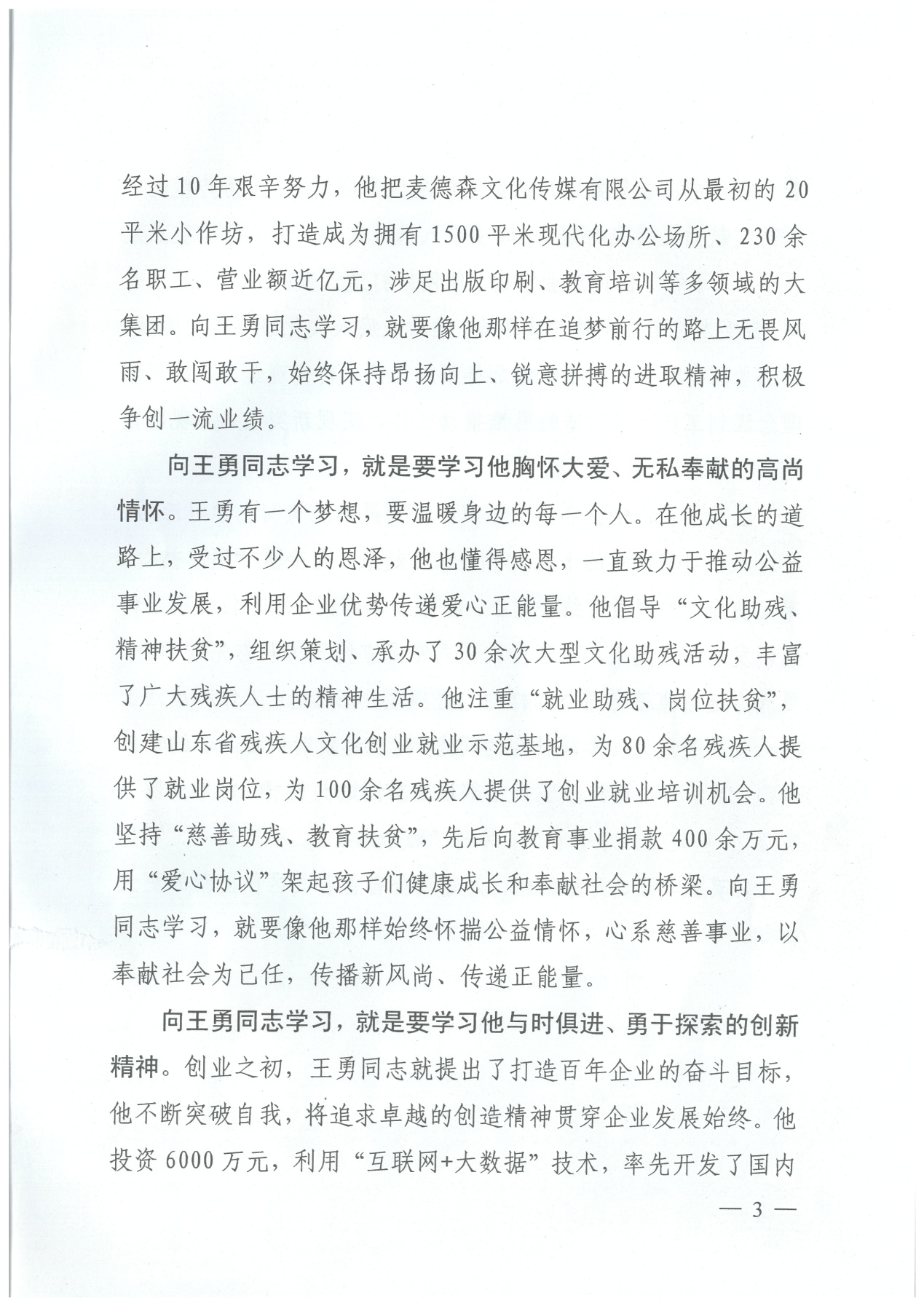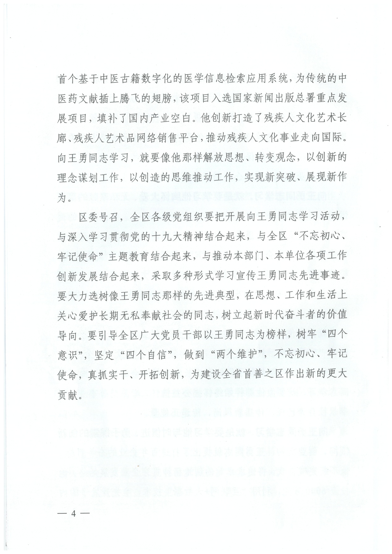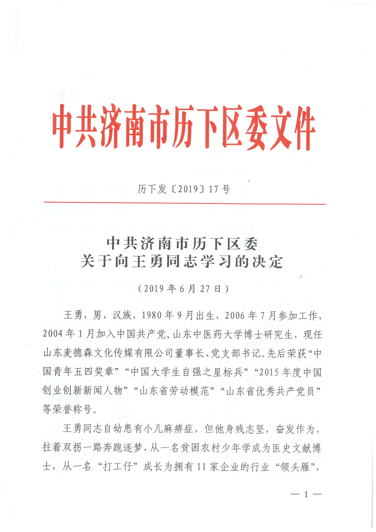中共济南市历下区委下发《关于向王勇同志学习的决定》