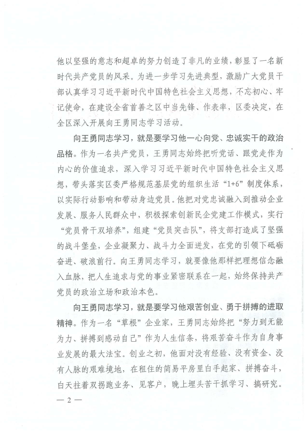 文件要求,向王勇同志学习,就是要学习王勇一心向党、忠诚实干的政治品格;艰苦创业、勇于拼搏的进取精神;胸怀大爱、无私奉献的高尚情怀。同时,将本次学习活动与深入学习贯彻党的十九大精神相结合,与全区“不忘初心、牢记使命”主题教育相结合,与推动本部门,本单位各项工作创新发展相结合,为建设全省首善之区作出新的更大贡献。
