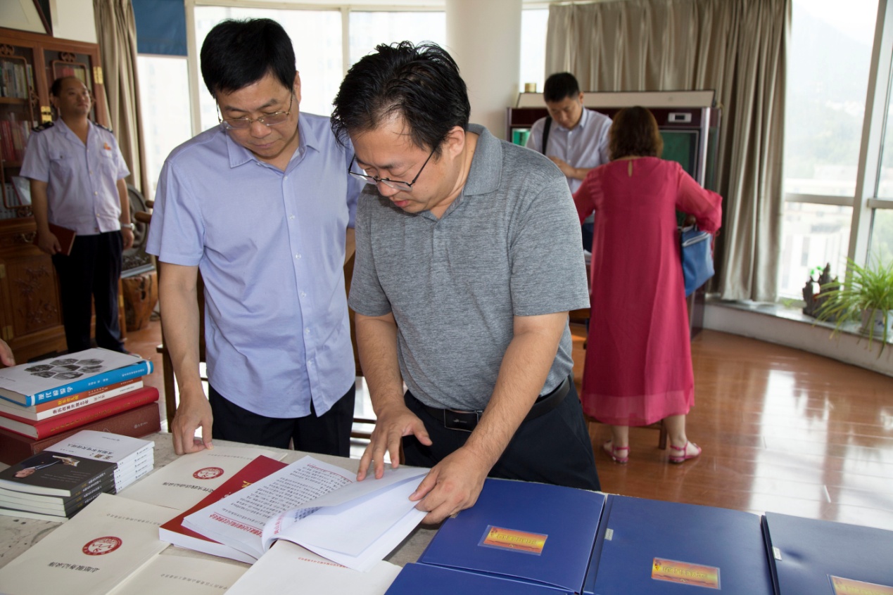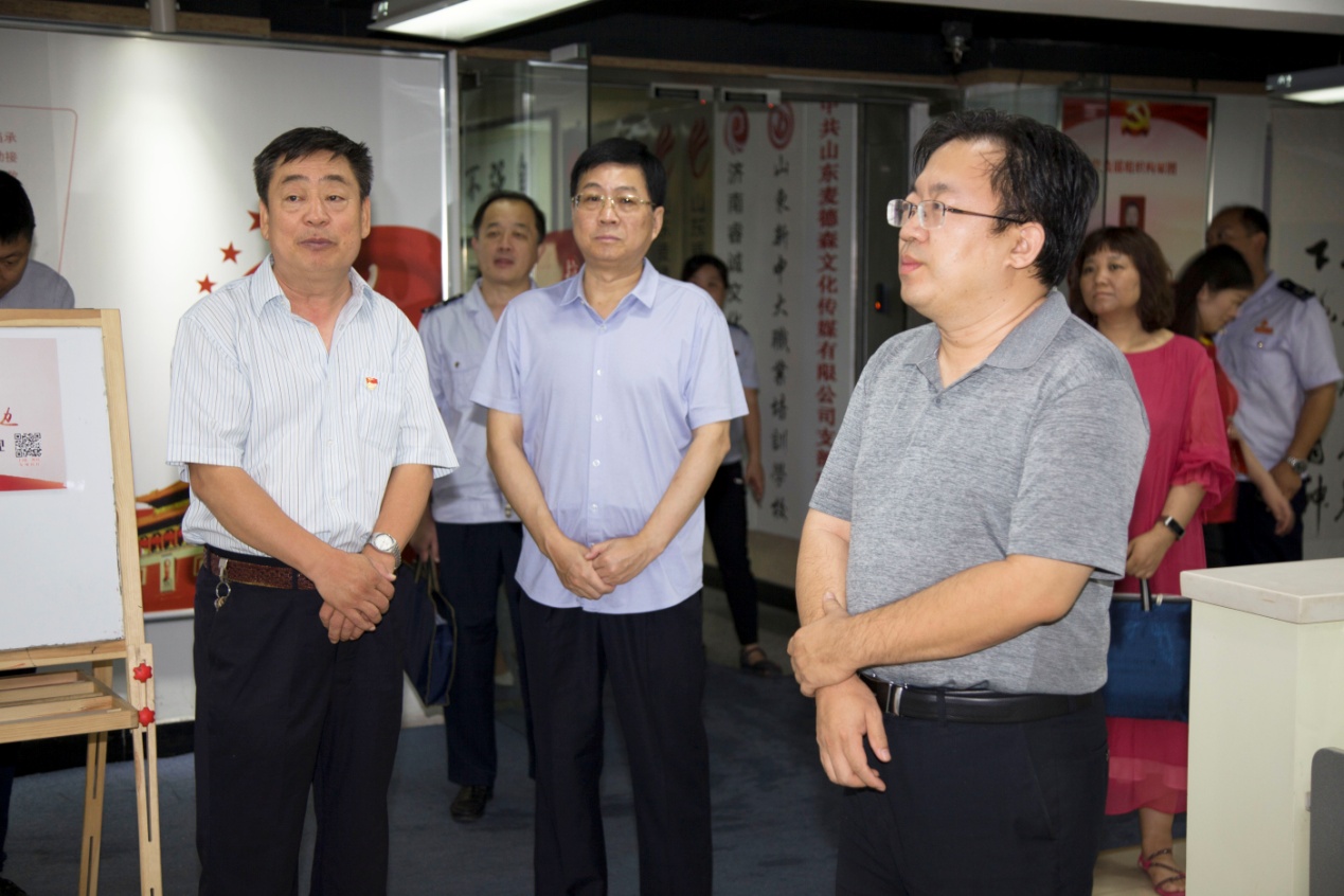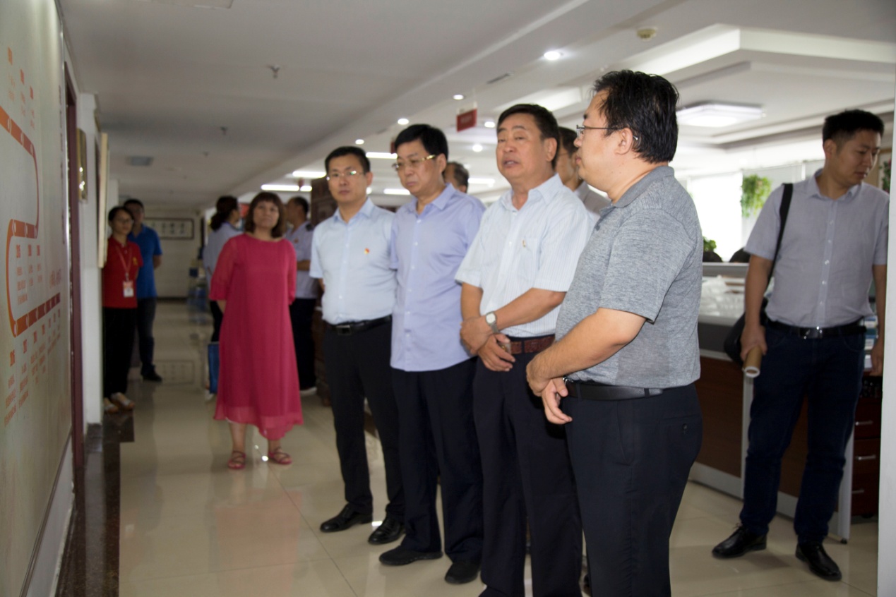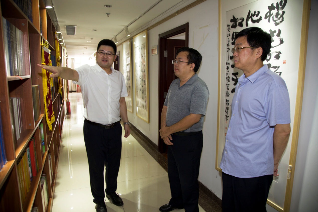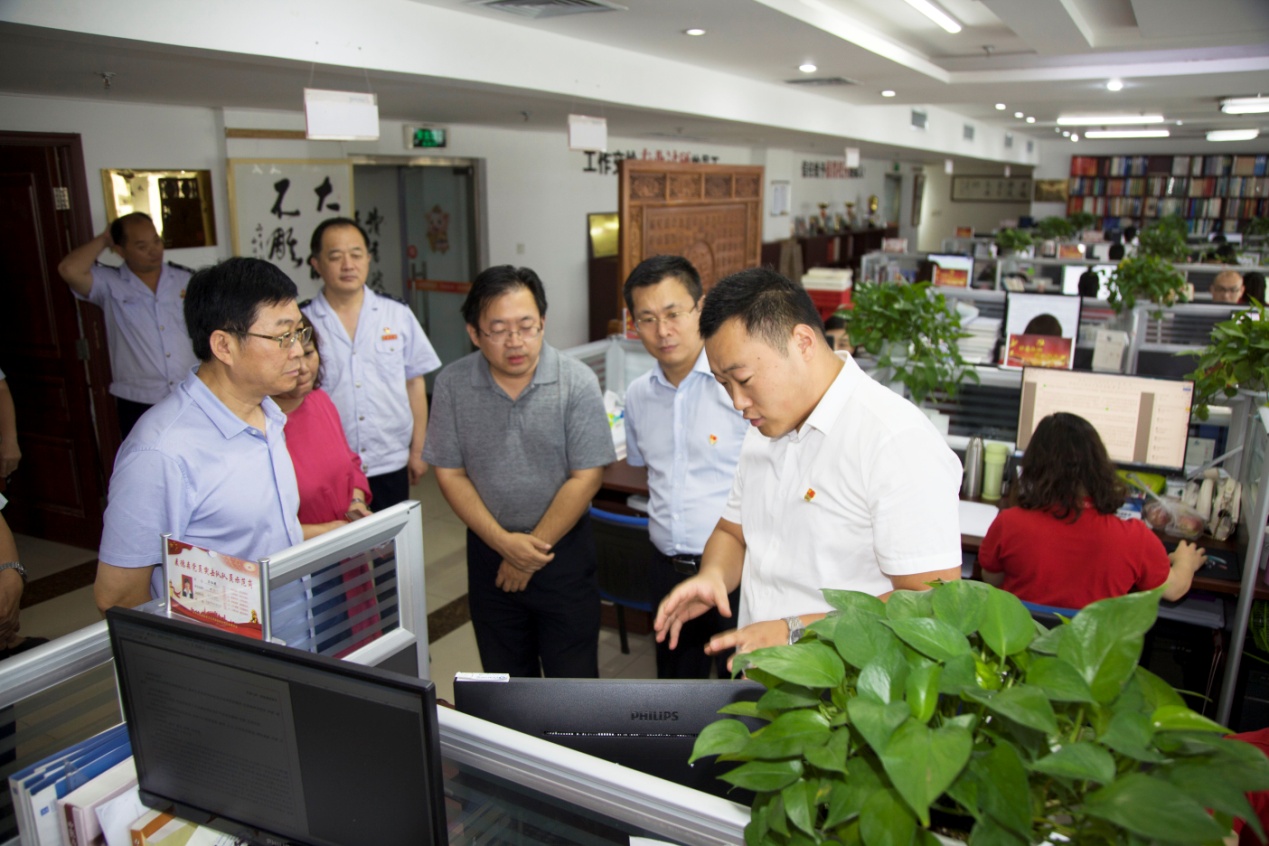 在桑守正等同志的陪同下,国家税务总局督导组一行对集团党建活动室、企业文化墙以及各业务职能部门办公区域进行了参观。参观过程中,受集团党支部书记王勇博士的委托,党支部桑守正副书记结合以集团党员为核心的党员突击队建设以及组织上高度融合、工作上相互促进的“长鼓型”党建工作法就企业现阶段党建工作情况向领导们作出详细汇报。随后,集团业务部门负责人向国家税务总局督导组介绍了“医学知识信息服务平台——‘博览医书’”、“史志年鉴编辑出版”等业务项目建设情况。
