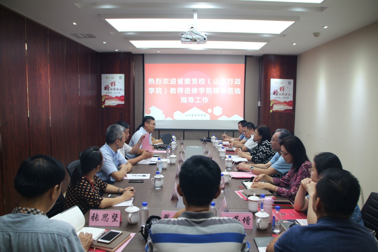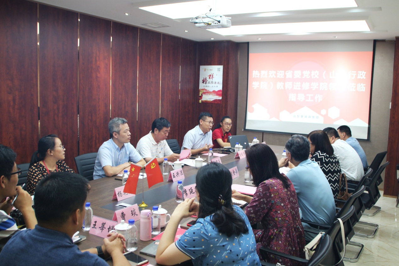 8月22日,中共山东省委党校(山东行政学院)教师进修学院党支部书记、院长王爱云,正处级领导干部张金弟,党支部副书记、副院长胡亚伟,以及学院党支部成员等领导一行莅临我集团党支部,围绕支部党建考察指导工作,并开展学习交流座谈会。受集团党支部书记王勇博士委托,党支部副书记桑守正同志、总经理李校伟同志等陪同考察。