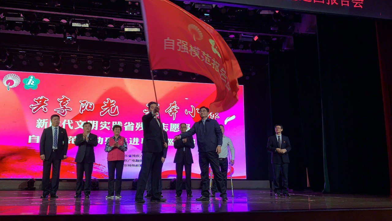 活动在学院师生《我和我的祖国》的歌声中拉开序幕。山东省残联副理事长、党组成员张文涛向省残联志愿服务队副队长张学坤授旗,标志着山东省残联新时代文明实践志愿服务队——自强模范与助残先进事迹报告团成立。